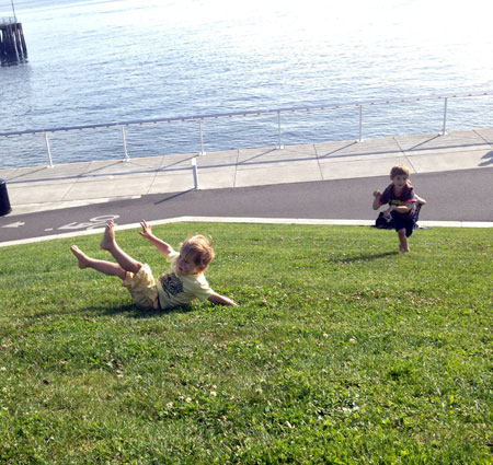 I called to see if he’d fix my flat and verify I could easily walk my bike to him. Turns out he’s just around the corner! So the toddler and I each grabbed our wheels and headed over.