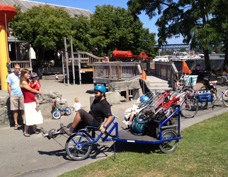 Things flattened out when we reached the coast and we had a lovely spin along Manitou Beach Drive until Biking with Brad led us away from an appealing (and flat!) NO CARS/BIKES ONLY beach path for a shortcut up Falk Road. He was too far ahead to hear the grumbling, but there were some choice words said between pants and wheezes. I made it up the hill, but only because my rig is way too heavy and bulky to walk uphill. But we all made it up, some with a few short rests along the way–something I probably should have tried, but I was scared I’d have trouble getting started if I stopped. I was definitely the slowest of the pack…though in retrospect I was the only person carrying two kids so I’ll let myself off the hook.