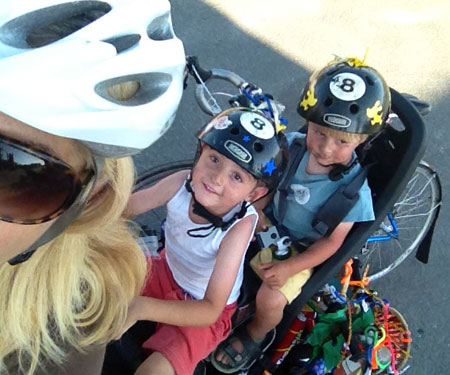 In the back he had a bunch of other gear, a kid bike, and the associated kid: