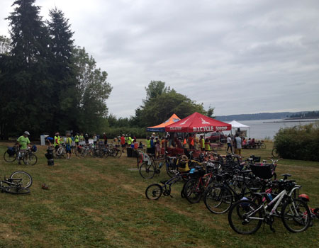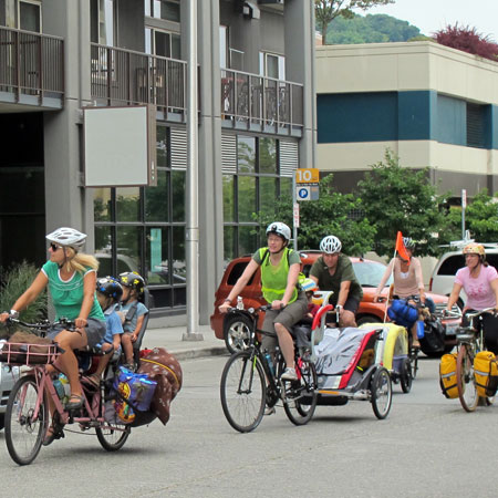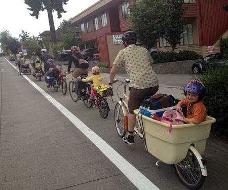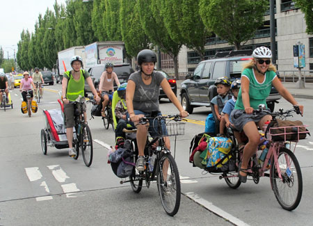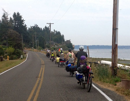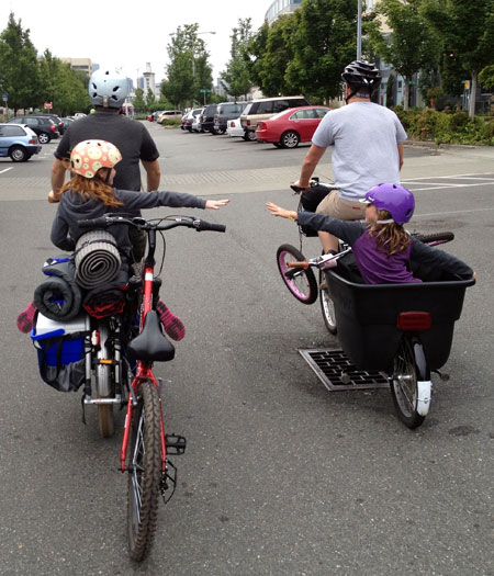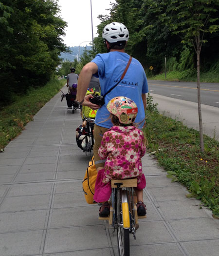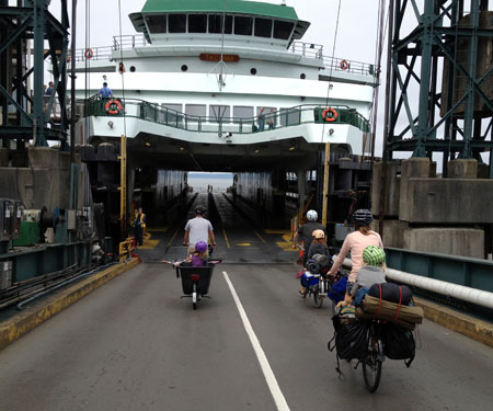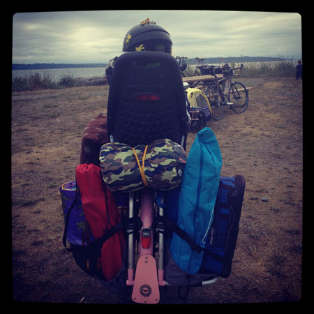 Ten pedaling parents loaded their bikes with camping gear (some more elegantly than others) and made the trek from Seattle to Bainbridge Island for a superfun bike camping adventure! Julian of Totcycle masterminded the whole thing as part of the Summer in Seattle Schedule of Kidical Mass. We’ve never bike camped before and brought almost as much stuff as we bring car camping…except no dog, no balance bikes, and no queen-sized inflatable mattress. The full-sized camping stove and four full-sized pillows will probably stay home next time, but we opted to go for comfort this first time out. Mr. Family Ride hauled our single Burley trailer crammed full of the heavy stuff while I carried kids and lighter bulky stuff. I used my WideLoader on one side and had to resort to the aid of one bungee cord to hold my mass in place on the other.