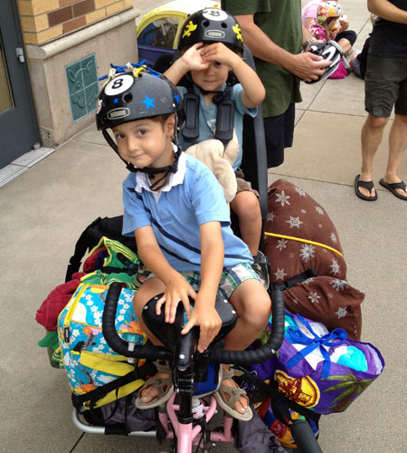 We broke camp Sunday morning to ride back to Winslow for Bike for Pie. Mr. Family Ride was able to get his bulky messenger bag into the trailer and I moved one of the kid sleeping bags to the back for a much slimmer load day two.