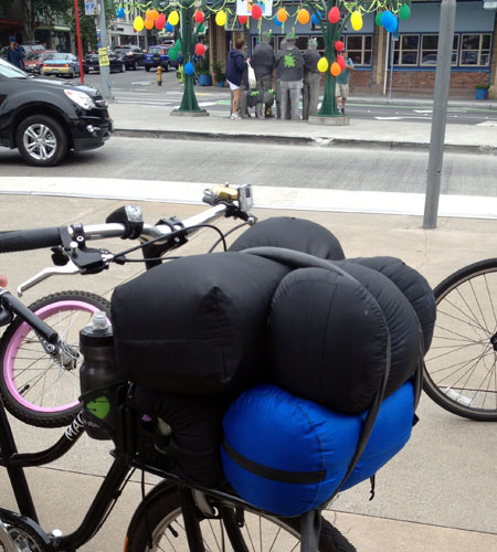 I thought the four sleeping bags on the frame-mounted front rack of Kevin’s Madsen bucket bike looked particularly compact and awesome: