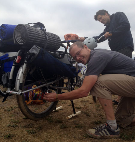 Julian and Kevin did some derailleur work before heading out. Dig the campfire kindling bike repair stand.