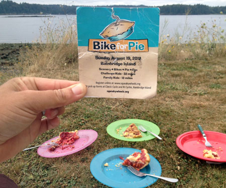 We stashed our gear before starting Bike for Pie and I thought we’d have an easy time of it for the 12-mile family course. But family-friendly on Bainbridge Island doesn’t equate to flat. Silly me. Near the pie stop, I saw a kid with training wheels and an adult on a minibike, but I can’t imagine they did the whole course; it was hard! But the event was wonderful. The 32-mile challenge route had two pie stops while our 12-mile family route had just the one. The stop was well-stocked with pies of many varieties (though only sweet at this stop, while the other one had sweet and savory, we heard) as well as music and dancing.
