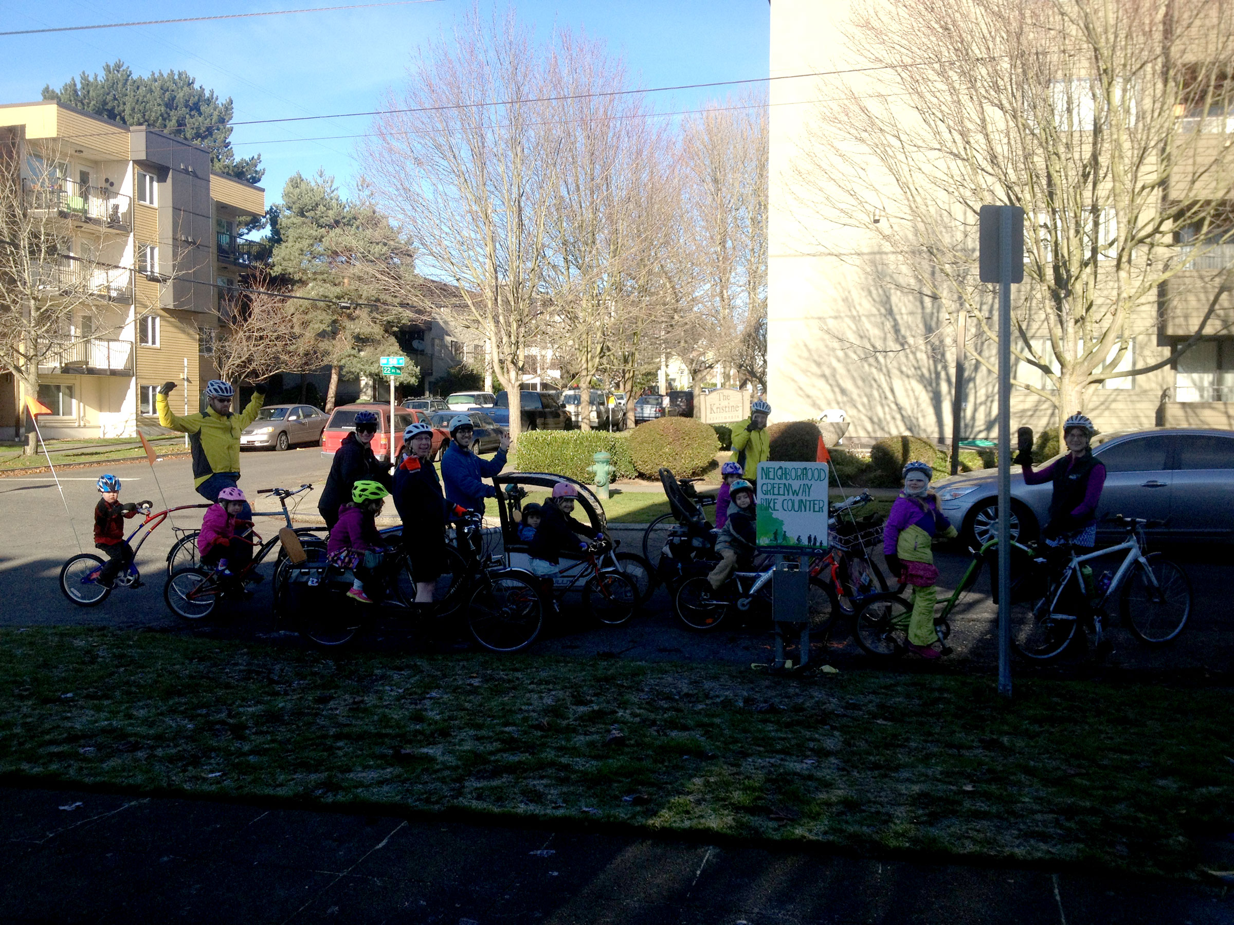 We went a bit of the way up Mount Tabor for a gorgeous view of Mount Hood. Most riders took pictures of the mountain, but I opted to take pictures of the picture takers. The kids were not impressed–they’re loyal to Mount Rainier.