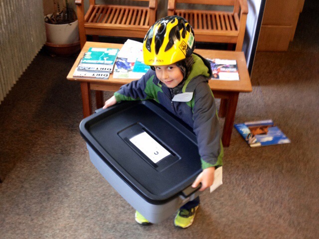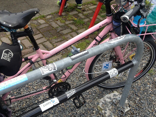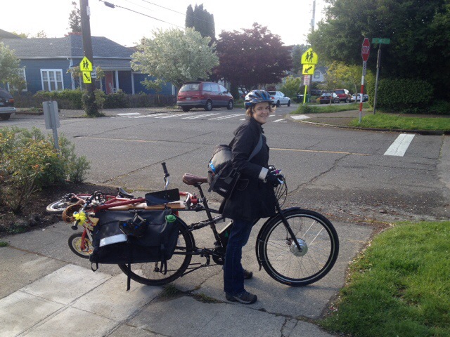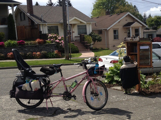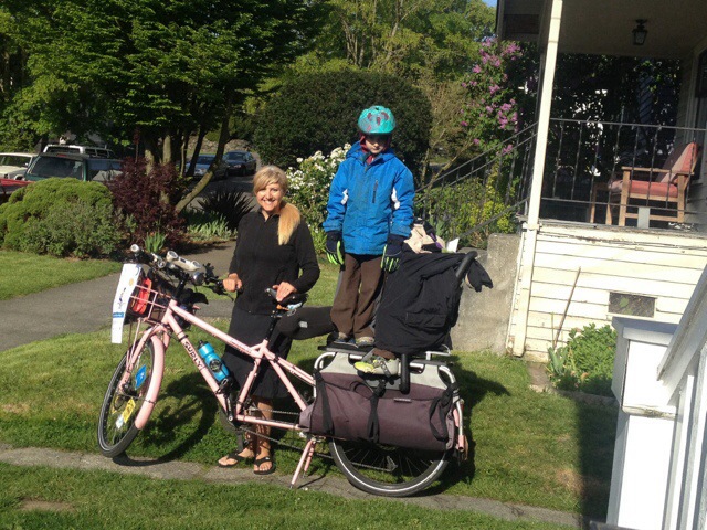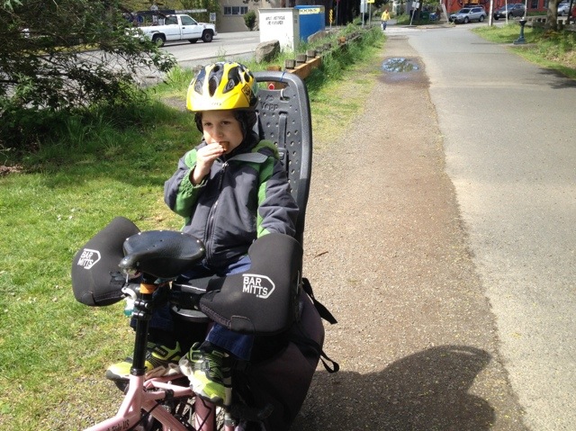 It’s always tempting to do something epic for #30daysofbiking and I hadn’t done anything above and beyond yet so I tried to ghostride my seven-year old’s bike from my old mamabike as I readied us for a dentist appointment. It didn’t work. But laying it on top of the Bobike Maxi rear kid seat worked fine for the three-block ride to school.