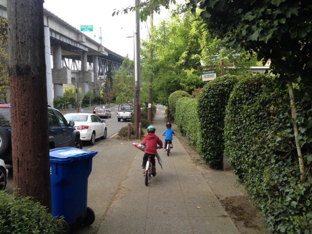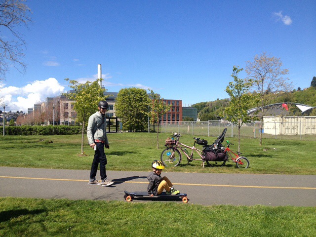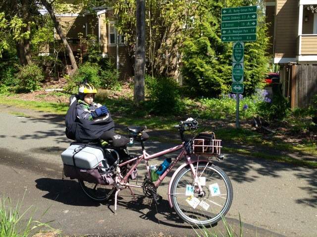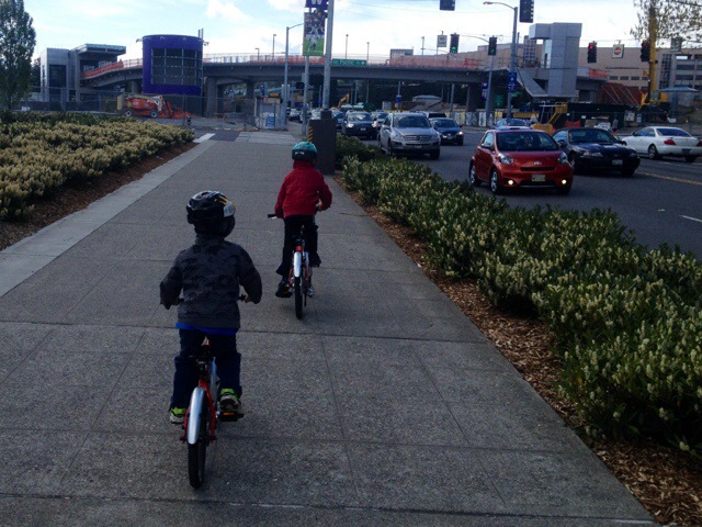Then we biked 1.5 miles from the Transit Center to the dentist. Up until this point, it would have been easier to travel without the bikes with the first bus stop a block from home and the transfer just a block away (not to mention the broken bike rack). But not having to transfer to a third bus (I can’t even imagine!) and riding the Issaquah trail system (and a bit of the Issaquah sidewalk because I didn’t want to put a kid on the bike lane of busy Gilman Avenue was awesome.