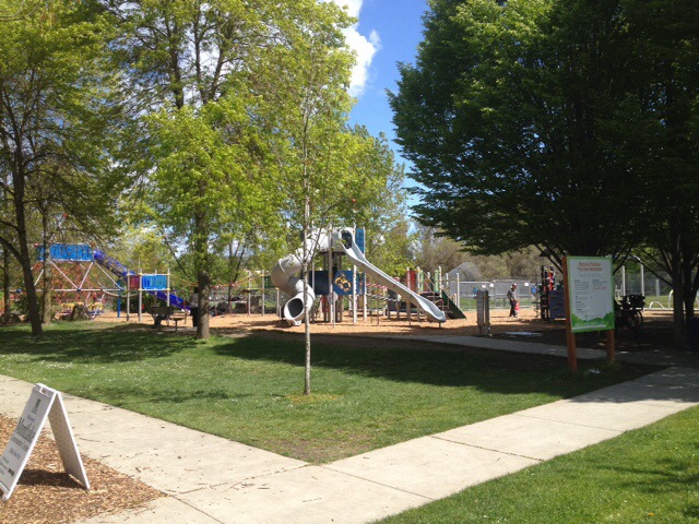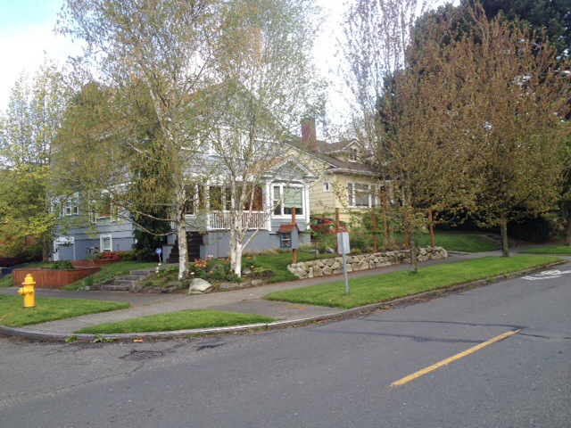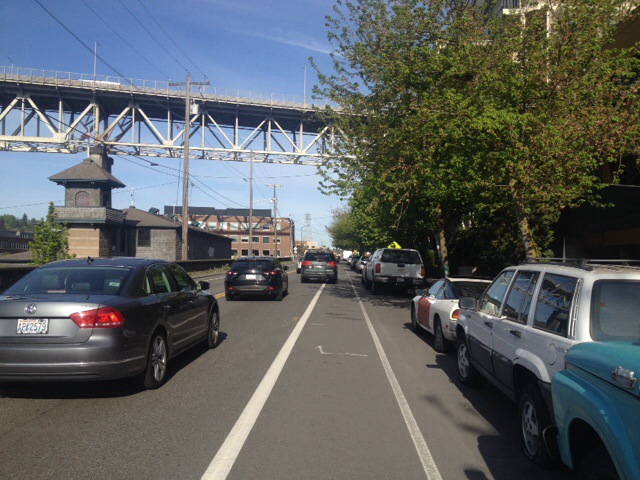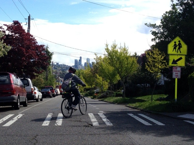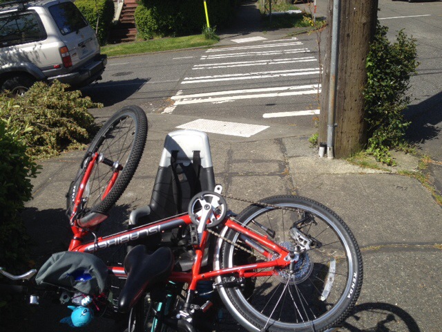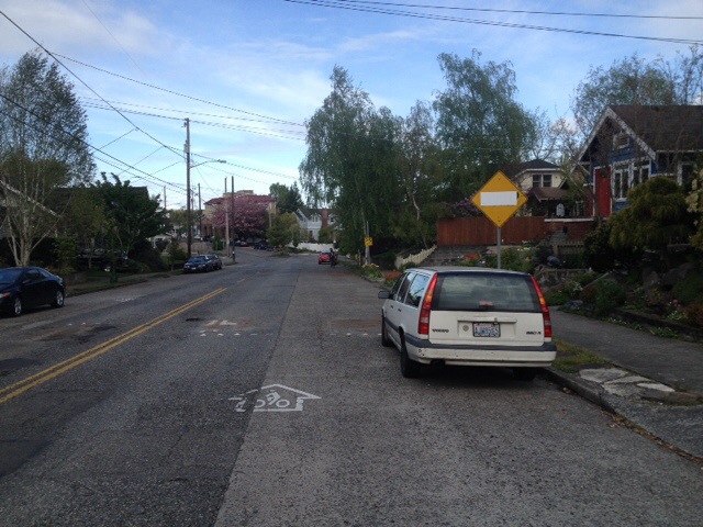 It was a weird morning. I thought the warm sun would make everyone happy and calm, but I saw a lot of odd behavior. This woman in the minivan drove two blocks partially in the bike lane. I thought she was preparing to turn right onto Troll Avenue (not that that makes this OK), but she kept going straight. I was more peeved than normal because I almost got doored right there yesterday. My first near-dooring, by the way–silly me for not realizing the driver of the wide truck, just pulled in and still a foot from the curb with motor running was done parking and about to open his door. I usually ride clear of the door zone, on the left edge of the bike lane when our bike lanes are painted partially in the door zone (*I say usually because when I’m going slow enough uphill that I can see into each and every car it’s not such a big deal–I can slow my crawling speed to a stop if I see a door opening). I’m hoping I scared him enough that he’ll look from now on. A gal can dream. I didn’t have either kid on board so I’m not nearly as shaken up by it as I’d otherwise be. Anyhow, I was peeved and slowed next to her minivan to look in the window and see if I could figure out what was going on. She didn’t even notice me or feel my *mom stare*. Sigh.