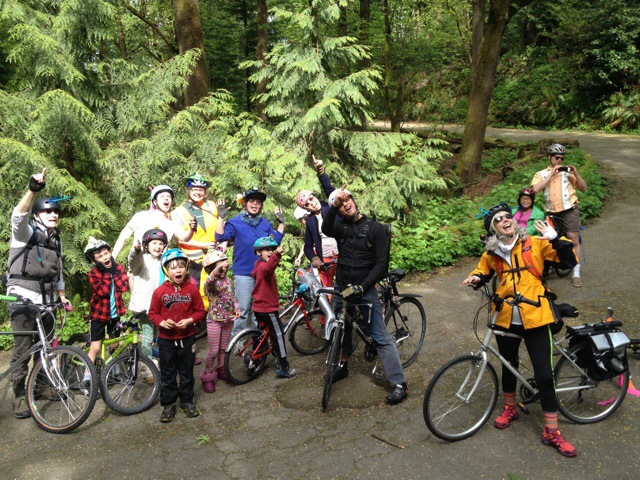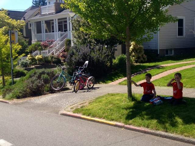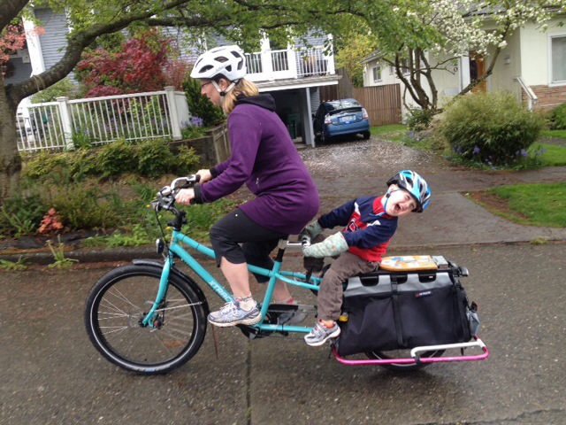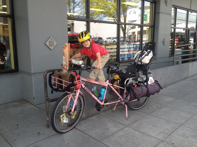 Welcome to the last day of 30 Days of Biking! Here we are all loaded up for the morning school run…well, after the seven-year old sat down, the four-year old unhid himself, and I retrieved my helmet from the neighbor’s porch (I use it as a tripod for these TimerCam photos, iPhone wedged in a vent).