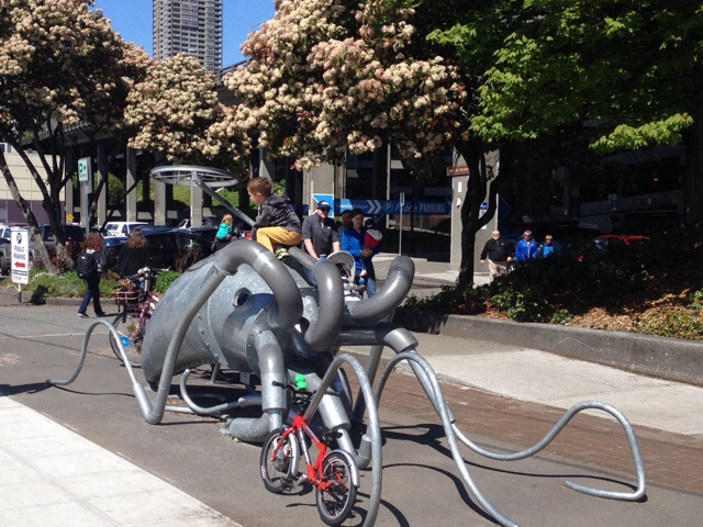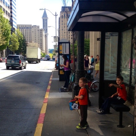 So we hung out and snacked and watched most of the bicyclists on 2nd Avenue take the right lane, though a couple braved the 2nd Avenue Bike Lane of Death. And then one minute before our bus was due, both kids declared they needed the restroom *now*. So we saw the bus come and go as we went in search of a potty. The first Starbucks was bathroom-less, but the second Starbucks delivered…but now it was only six minutes until the next-next bus. Which we made, amazingly.