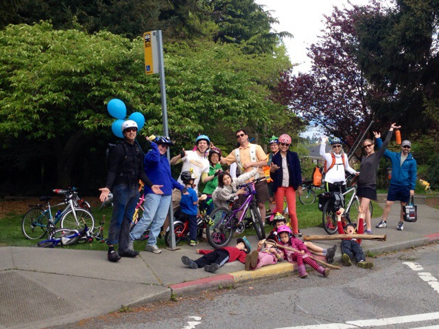 Then on the way to our elementary school dropoff, the guy in the red shirt said, “I commend your choice of mode of transportation” as he passed us. Aw.