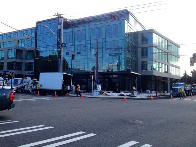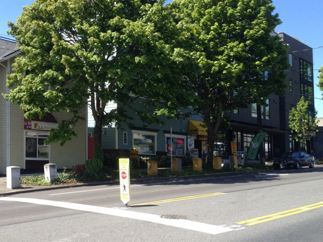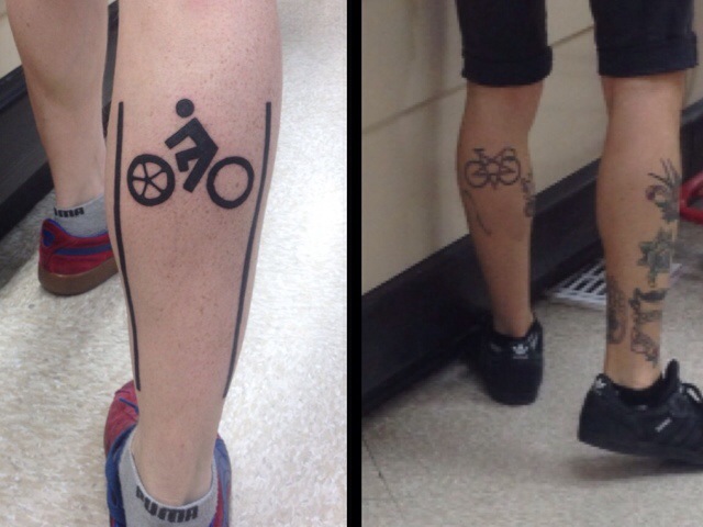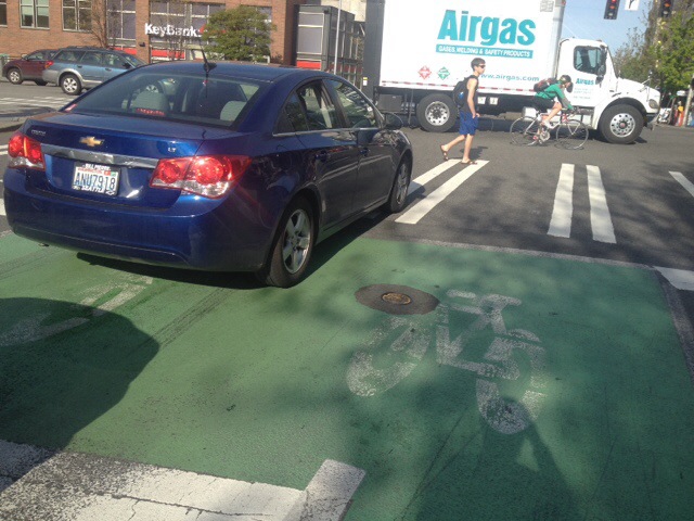 Then this in the bike box. But it gets worse! At the red light a woman on a bike charged in front of me and started making a left turn into that cross walk (that light was no longer green, by the way) when our light turned green and the car started moving forcing her to stop her weird maneuver and nearly tip over onto me. She collected herself and darted in front of the straight/right turn lane to get to the sidewalk. At least she made me forget about the minivan.