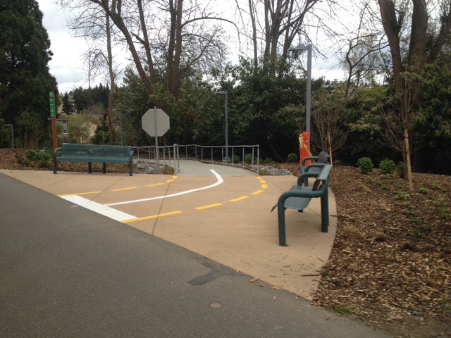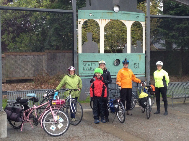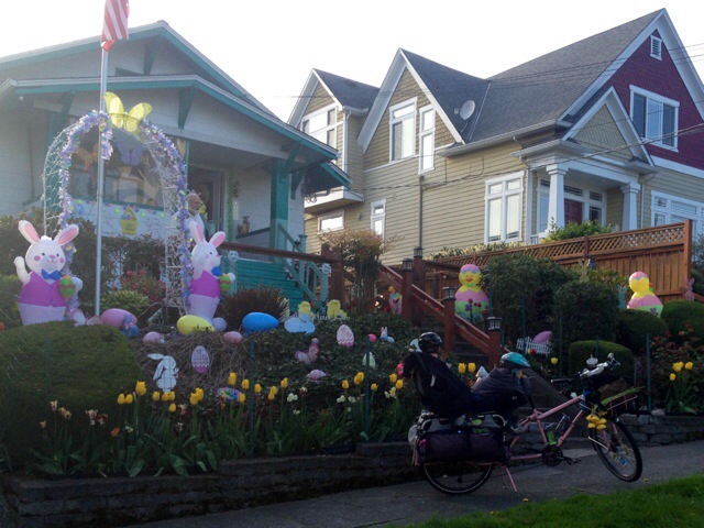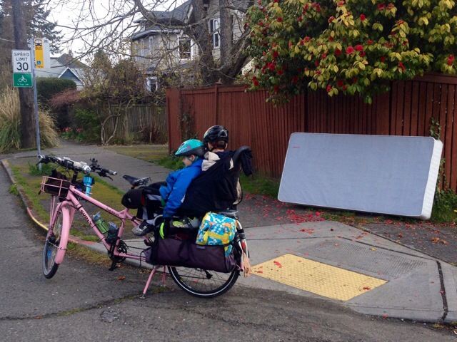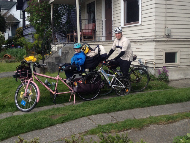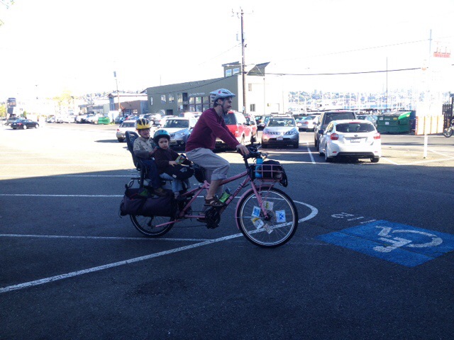 Just as we left Mr. Family Ride and the Burke-Gilman Trail we met up with this family of four on two tandems. I haven’t seen them since last year’s Labor Day Cargo Bike Ride, but today they were heading to the climbing wall and we just happened to cross paths. In the picture the passing roadie is probably asking a question about the cool bikes. I couldn’t hear him, but I saw him look admiringly at each tandem as he went by so I promise he’s not yelling or lecturing.