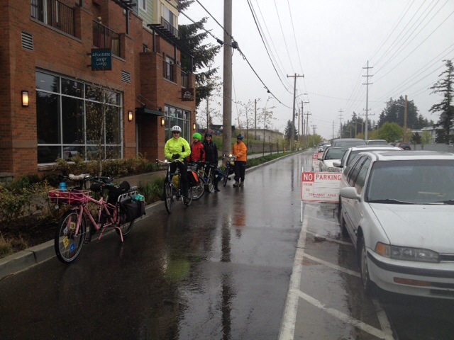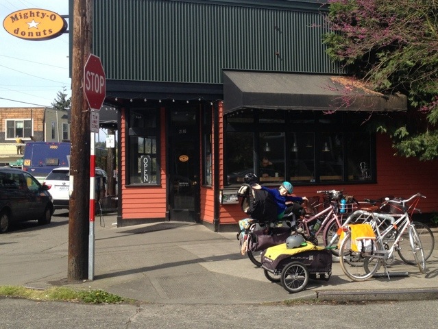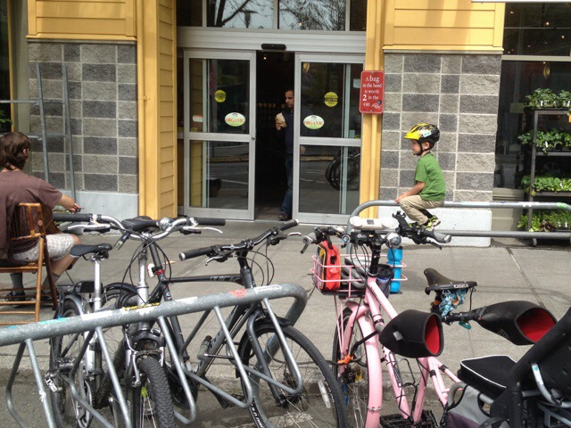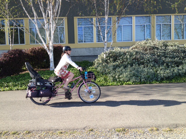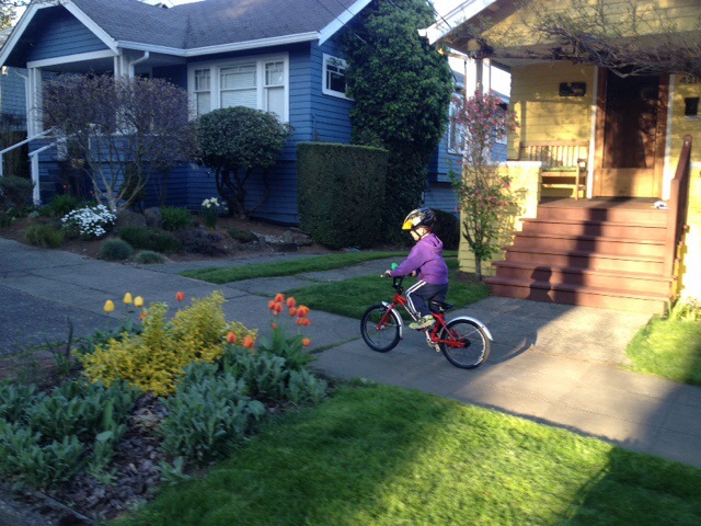 Today was THE BEST DAY! The gorgeous weather certainly had something to do with it–although it wasn’t clear enough to see Mount Rainier on the way to the grocery store this morning (our usual spot for seeing her), the skies were fairly clear and the day just got bluer and warmer. It was also nice to partake in a bike ride I wasn’t leading. While I love leading rides and enabling more families and women to get out on their bikes, it was nice to just coast along in the wake of today’s ride, responsible for only the three bodies on my bike. But today was really everything all together: the friends, the music, the weather, the laughter, the BIKES.