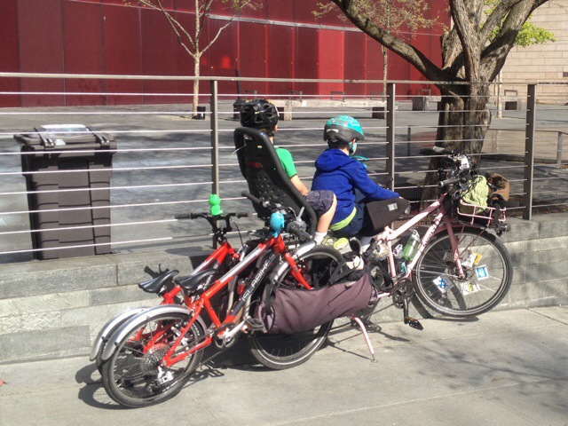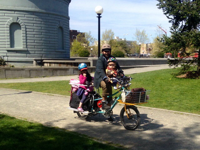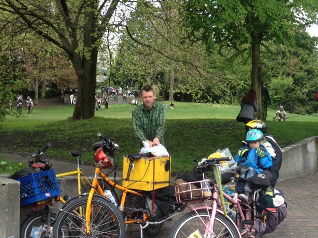 After that we didn’t have to do any riding alone until the end of the day–and just by chance. Mr. Family Ride was heading out for a ride at the same time as us so he kindly slowed to a quarter of his normal speed and took my longer way down to the Burke-Gilman Trail. Note the Danish Mosquito bike in my FreeLoader. We carried it along to the ride to lend to a little friend whose bike was recently stolen. Just his luck I haven’t gotten around to selling it yet.