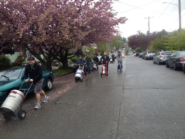 Davey Oil led the ride this time (and will do so for future Easter Cargo Bike Rides, I believe) and just look at this fabulous fivesome at the front! Davey and Little Oil, Tom of Seattle Bike Blog, Haulin’ Colin, and Velotron with his amazing bicycle sound system.