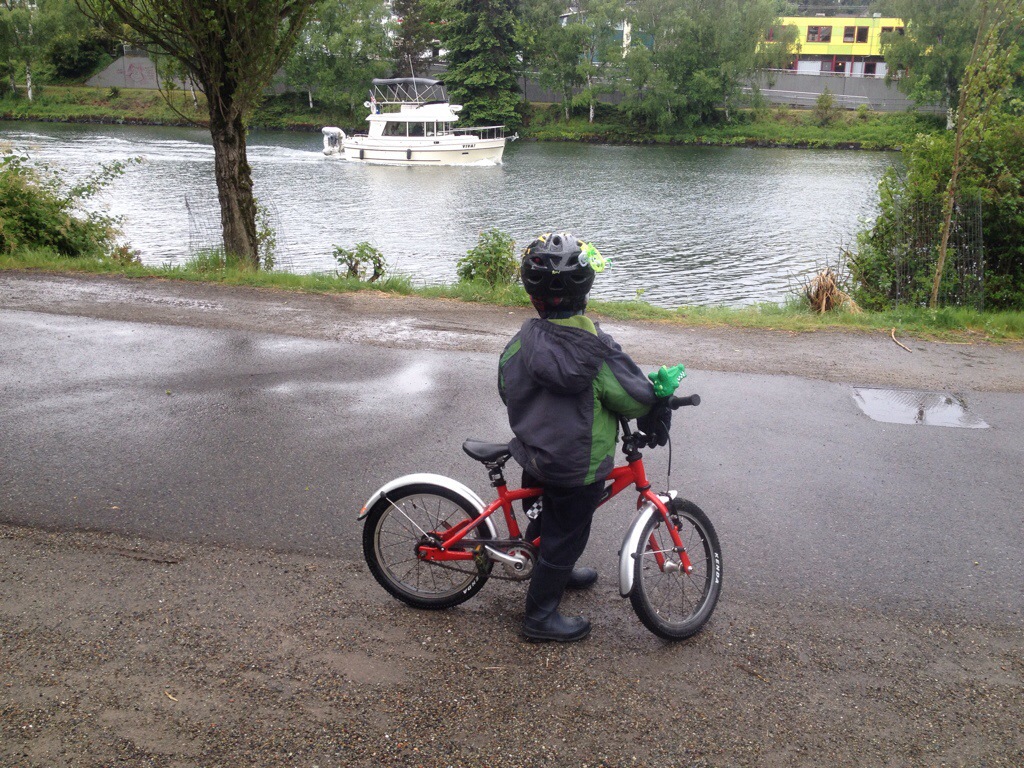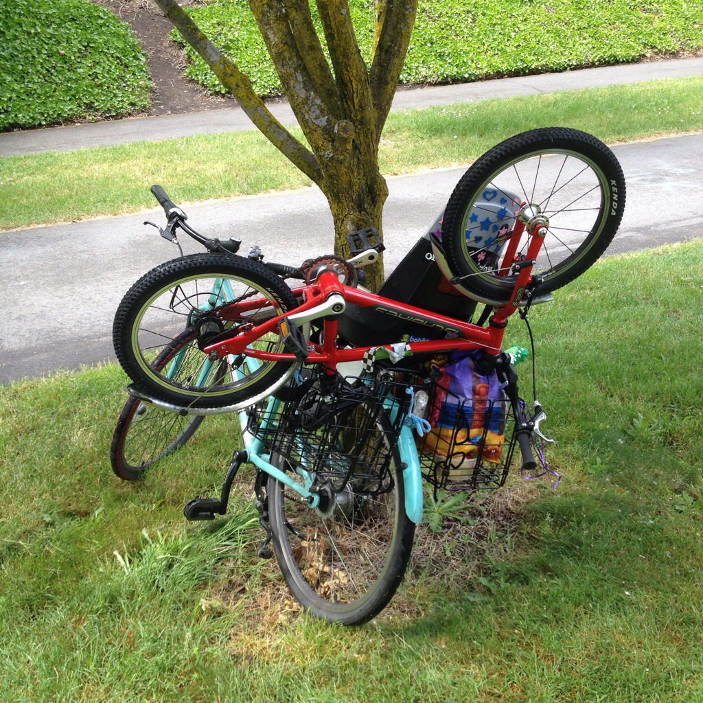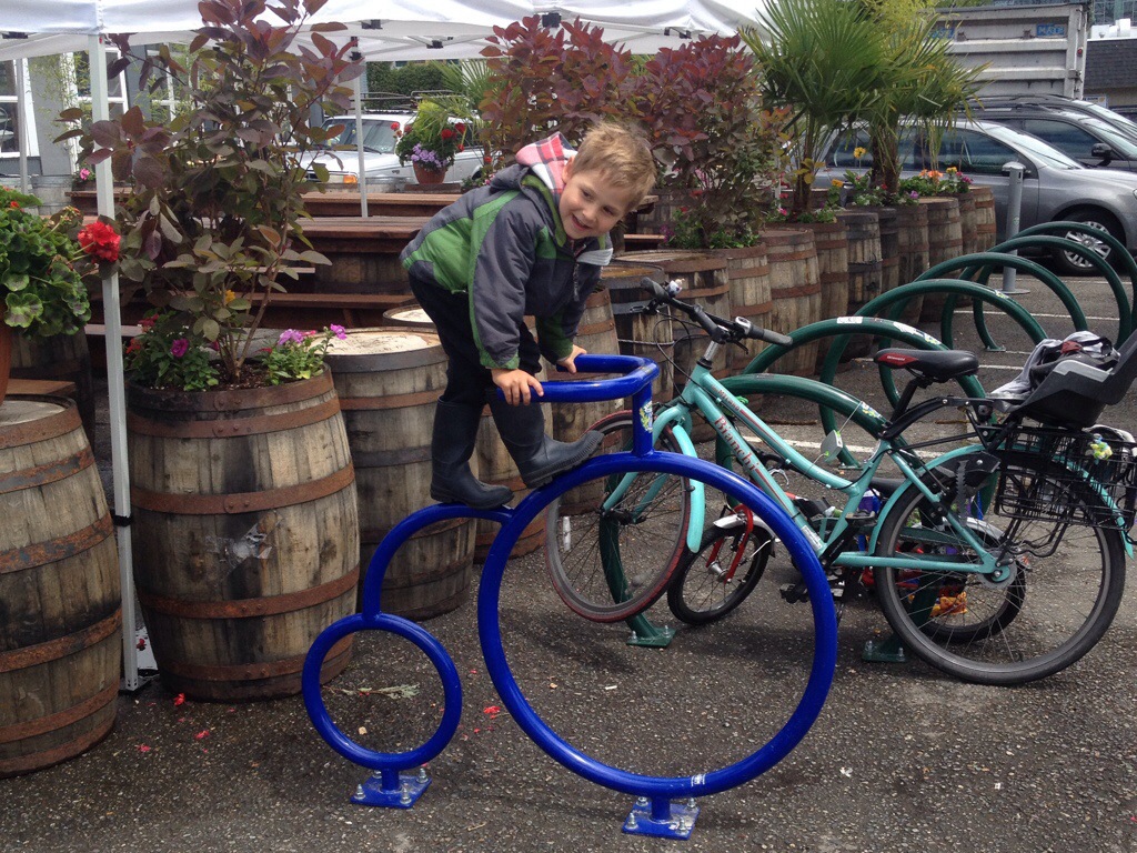 Our first stop was the kids’ bike rodeo, but the kids spent so much time at the adjacent bike decorating station (stickers, streamers, paper salmon, crayons!) that they didn’t get onto the course before the teeter totter broke…not catastrophically, just a crack in the plywood.