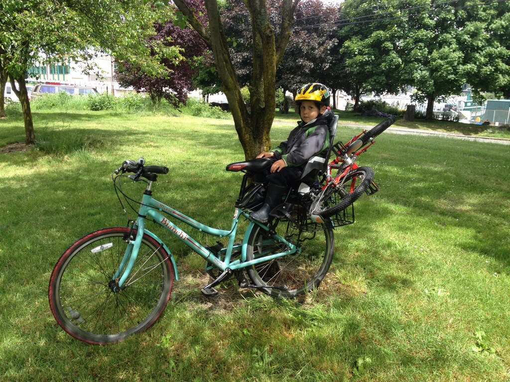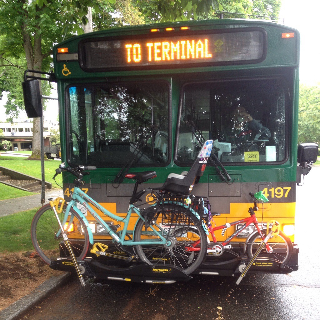 I don’t have a picture of my outfit from yesterday, but below is me on the cover of today’s Seattle’s Child magazine in my bike-friendly “uniform”: short-sleeved shirt, knee-length (give or take a few inches) skirt over leggings, flats. All from the Crown Hill Value Village thift store, now that I’m revealing all my secrets. HOWEVER, all my foul-weather over layers are from Hub and Bespoke: my Rainlegs rain chaps (that work fine with knee-length skirts with the middle buckles left fastened in front of rather than around my legs), merino wool ibex Striped Coppi Cap for cold days, and Clear Coated Rain Spats, though unless it’s really cold and raining hard I just let my shoes get rained on. As for the top, I’m currently sporting a too-big rain jacket I got for Mr. Family Ride, but I have eyes on either (ooh, or both?!) the Hub and Bespoke Women’s Riding Coat or Iva Jean Rain Cape (also sold at Hub and Bespoke). [The Seattle’s Child article about the local family biking scene is terrific–read it!]