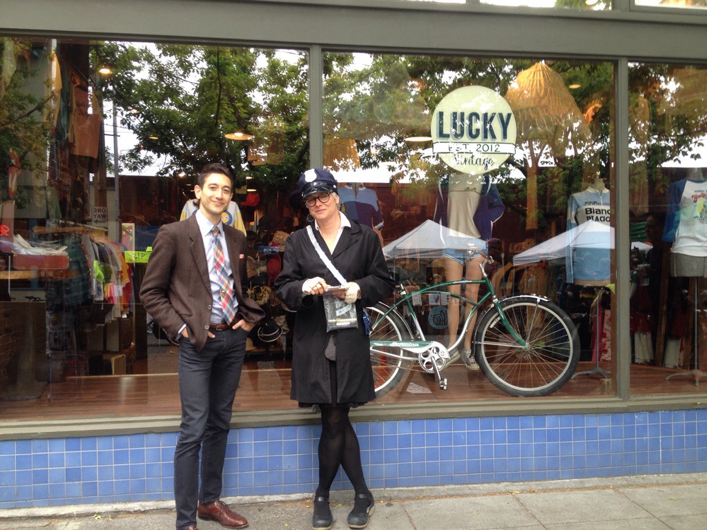Here are Aldan and Juliette of bicycle clothing and accessory shop Hub and Bespoke outfitted as bike style authorities and issuing citations to appear in the annual street party fashion show. Yes, I got one! I should hope so since I was in a Seattle Channel TV spot about Hub and Bespoke and fashion. Har har, obviously neither Juliette nor I knew it would be about fashion when she asked/I agreed to come down during the filming…but the funny thing is, biking so often has much improved my manner of dress.