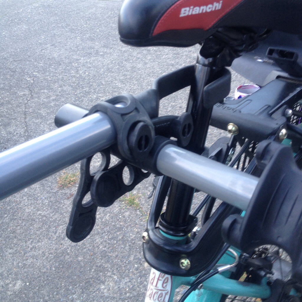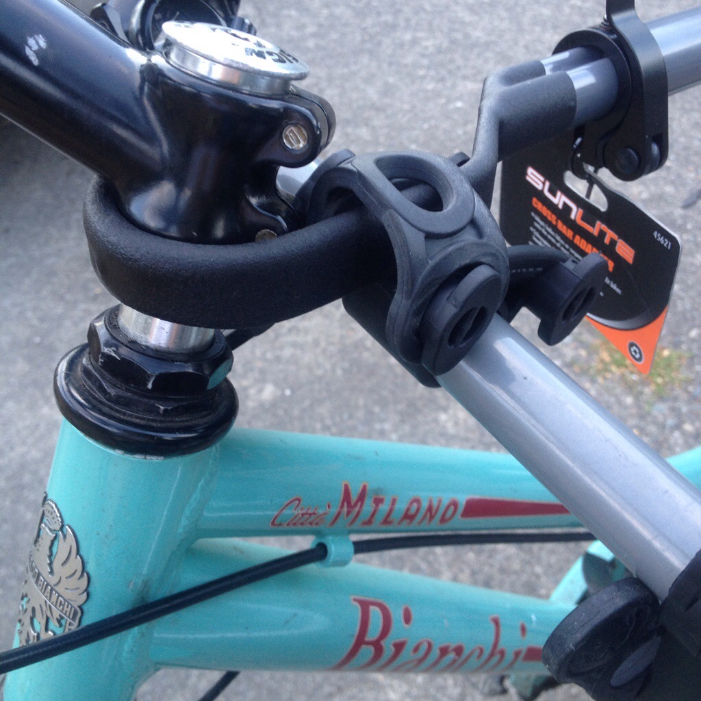After nearly six years with the old mamabike (Bianchi Milano city bike), I finally invested in a SunLite Adjustable Cross Bar Bicycle Adapter for Rear Car Rack to make the step-through frame fit on the car rack more easily. It’s great! I’ve only put the bike on the car a few times, but it’s worth it to keep it level and secure. I was able to squeeze the 20-inch kid bike on the rack, too, and the single Burley trailer rode shotgun (I was able to break it down even more and shove it in the trunk for the ride home) and the 16-inch kid bike in the trunk.