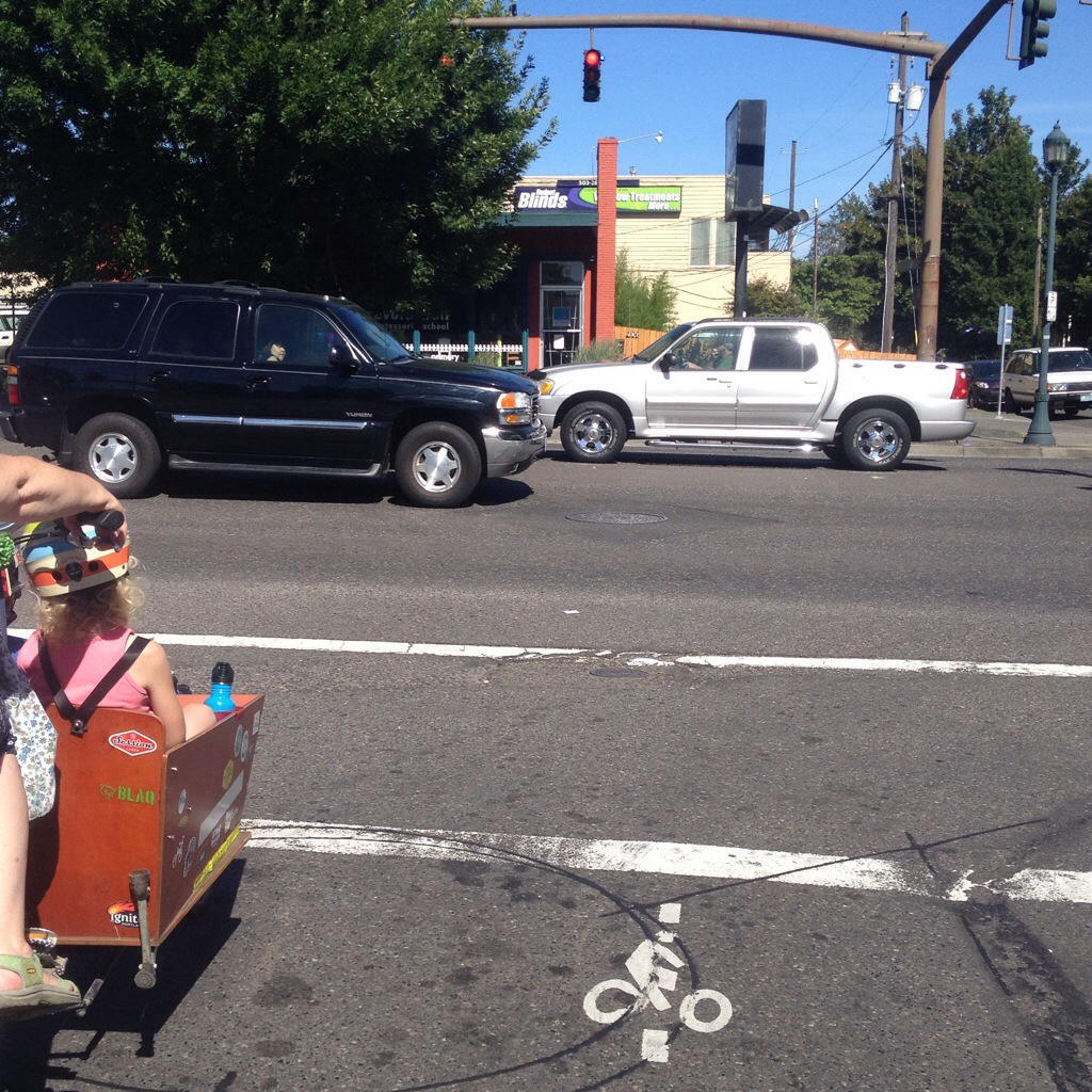 Ah, Portland. I could have squeezed around his car, but figured he’d be quick enough so we stopped and waited so he’d notice us and feel bad and hopefully think twice about obstructing a bike lane in the future. Bringing a bit of the passive-aggressive Seattle style to town.
