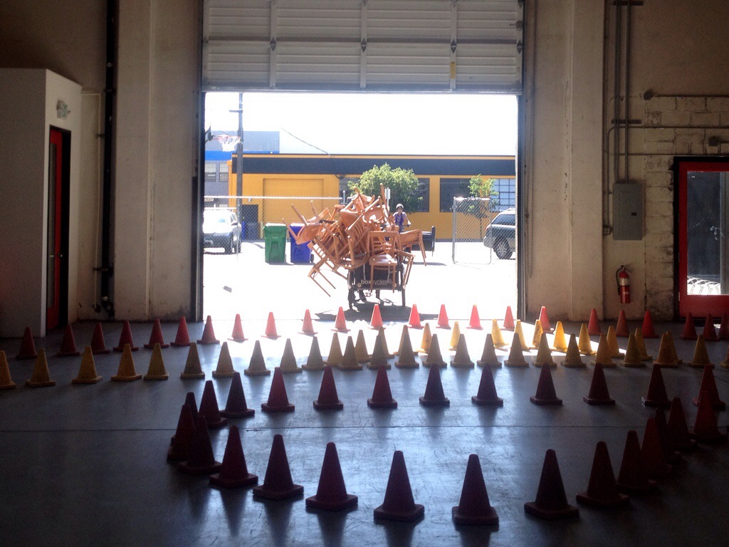 While we were inside the warehouse I saw the strangest sight out the back door–some sort of vehicle piled with 300 wooden chairs followed by a longjohn holding a couch.