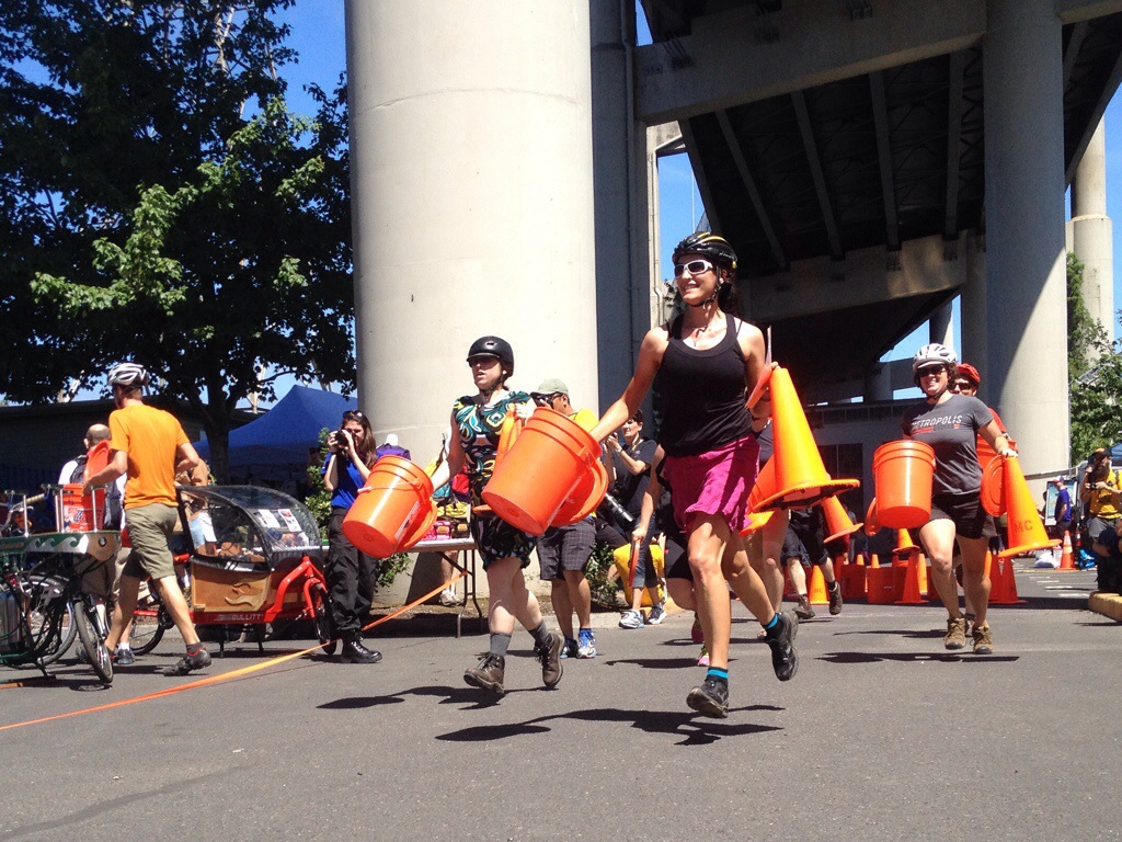 Unsurprisingly, it was Emily Finch ferrying over a bunch of furniture for the Disaster Relief Trials afterparty. I had hoped to see her new Metrofiets this week (replacing her stolen bakfiets), but it’s not quite ready so she was on her Christiania cargo trike and followed by her eldest daughter on a borrowed Bullitt.