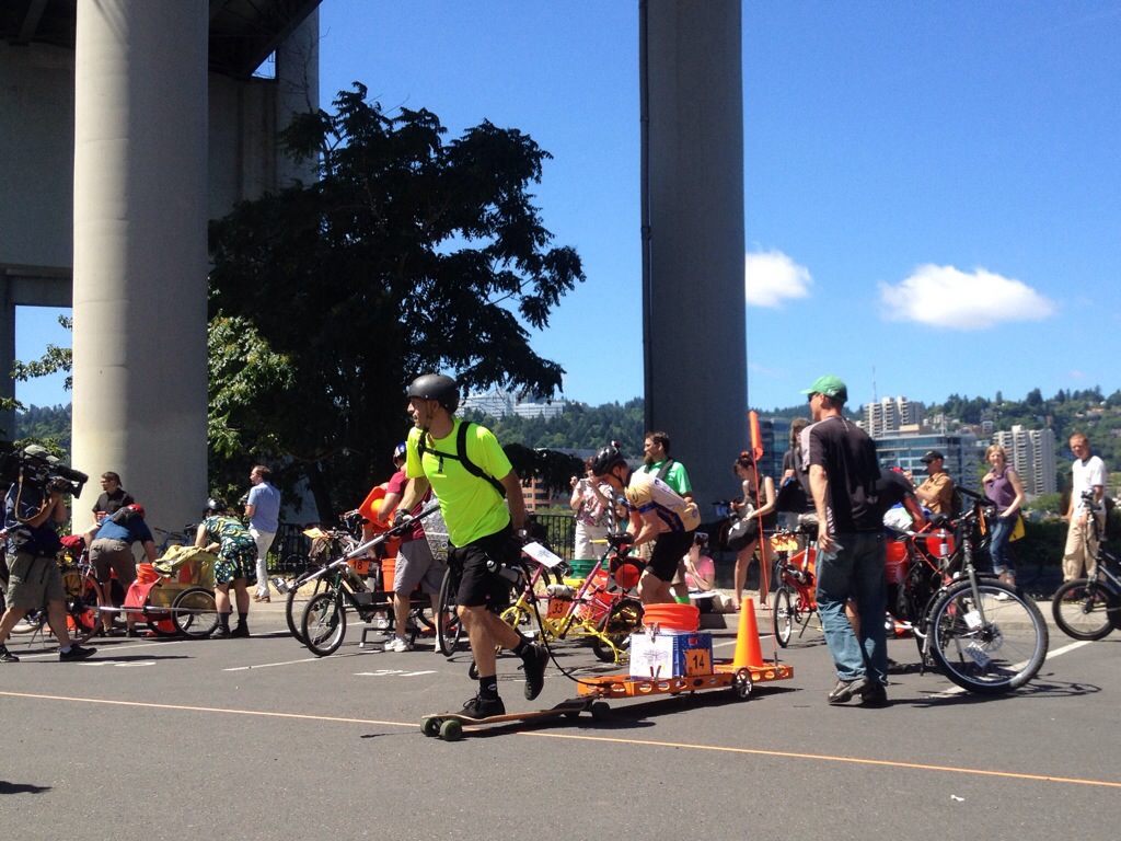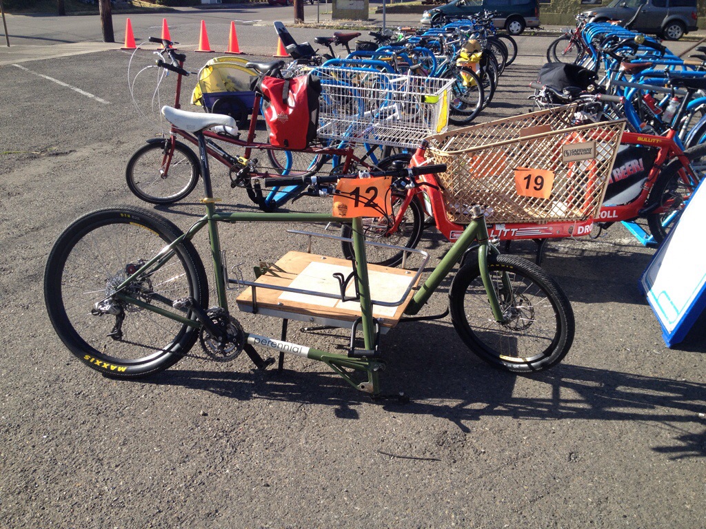The DRT after-party at Islabikes was hopping…despite adequate seating thanks to Emily and daughter. The caliber of the temporary bike parking in the rear parking lot was amazing. I wish I had thought to ask where all the racks came from. Good bike watching, too! I love this Bullitt with a grocery store shopping cart body as its cargo box. Part of “Team Beer” according to a sticker on the frame. Go Team Beer!