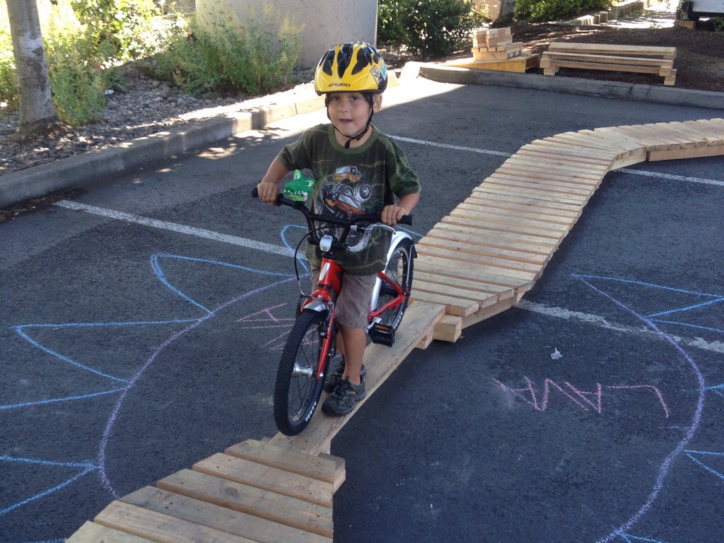 The Fiets of Parenthood course was tough! First up: raised, twisty track with very narrow bridge over hot lava. Most of the kids shuffle-stepped across it, but I had to put a foot down to help drag my trailer back up on the track. Ouch, it burned!