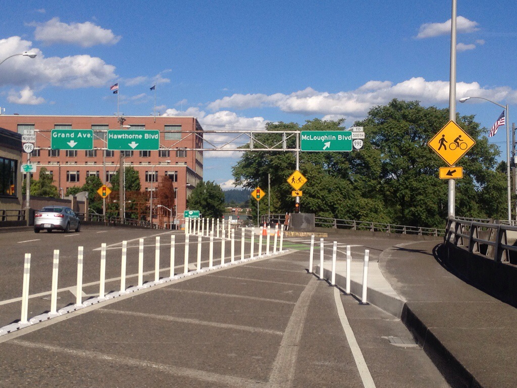 The following day I took the Hawthorne Bridge to Clever Cycles and the true meaning of the new bollards sunk in. I thought they were excessive because cars have always waited for me here–maybe even too much…on our first visit a car stopped for me when I was quite far back from the intersection and had to awkwardly wait for close to a minute while I made my way uphill to the crossing. At first I thought maybe this was to prevent weird over-waitings like that, but it’s really to add this passing lane!