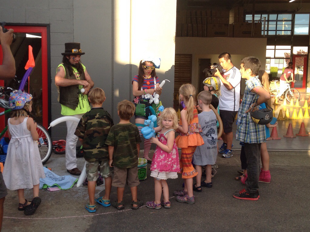 The kids were kept busy riding the test track. It’s normally made of bike boxes, but Islabikes had borrowed a bunch of cones (dirty ones, I think they had been part of a mountain-bike- or off-season cyclocross race) which worked better for multiple bikers at once. And Olive Rootbeer and Dingo rode up on their tall bikes to wow the kids with their clown skills, storytime, and balloon twisting.