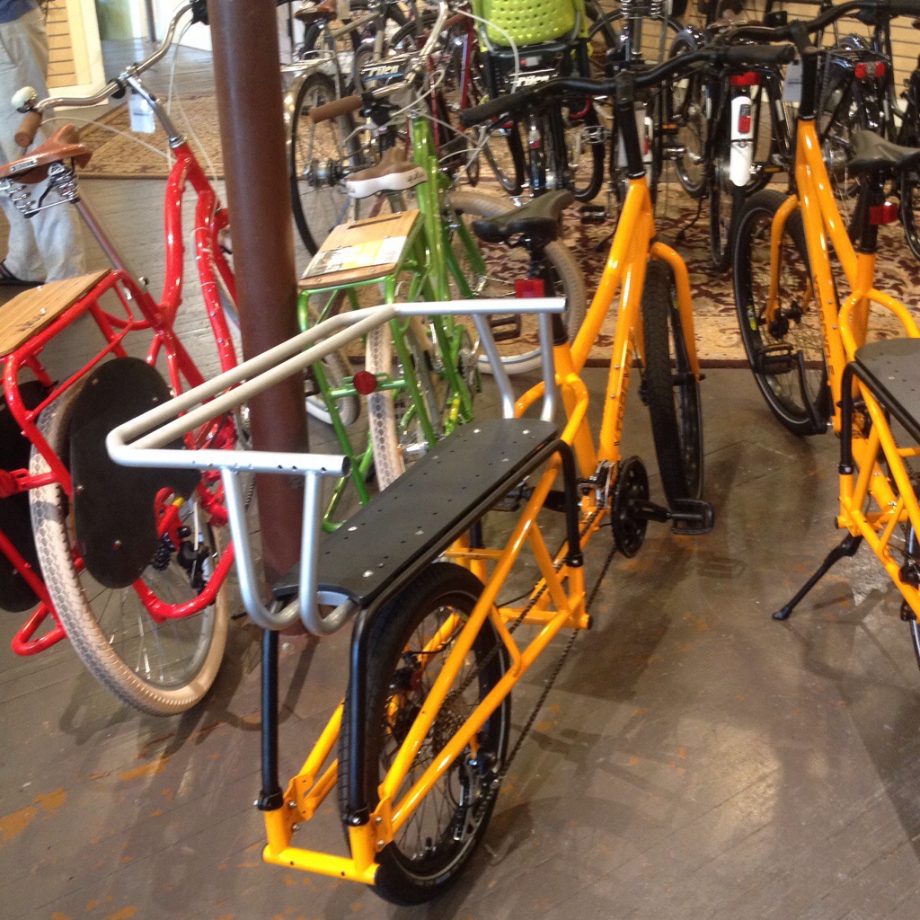 At Clever Cycles I saw a half-a-Hooptie! I’ve been thinking about doing this myself. They said quite a few customers have done this and like it. I want to preserve easy access to my FlightDeck for a kid to hop off and push the walk button at intersections without loop detectors (maybe not an issue in Portland with all those little blue lights) and because I like sitting on my deck and I don’t fit in the full Hooptie. Others roll this setup so they can use the removed rail as a step rather than buy a set of U-tubes.