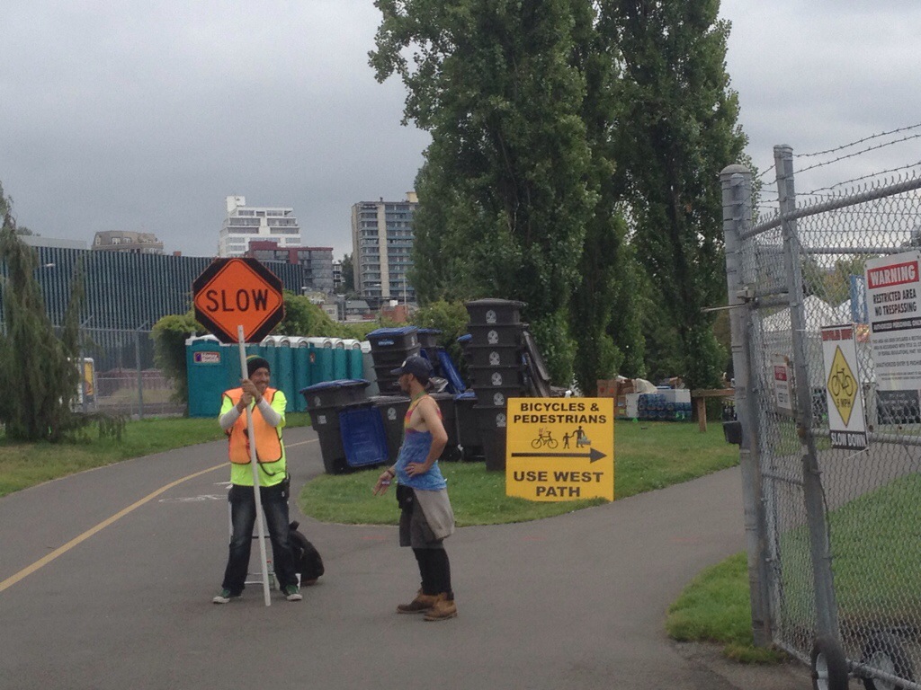I was relieved Bainbridge Island’s Bike for Pie event didn’t coincide with Hempfest this year, but our trip to the ferry on August 14th was subject to the cannabis convention construction. It wasn’t really so bad, but we were routed away from the bike path to the narrower walking path and our forward progress blocked by mis-parked trucks a few times. I knew from signage ahead of time that I’d have to contend with this detour, but I figured setup wouldn’t be so bad that I’d want to forgo the longer, flatter trip to the waterfront. Traversing the area during Hempfest is totally out of the question and our return trip was during clean-up which I figured would be worse than set-up so we took the shorter, steeper trip on our way back home.