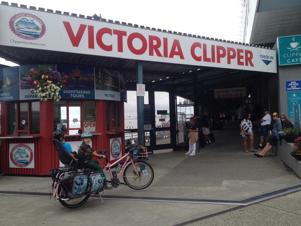 The Victoria Clipper isn’t cheap, but it’s extremely convenient. Less than three hours to get to Victoria, and it leaves from easily-accessed Pier 69. Regular bikes are $20 each way, but big bikes, like mine, are double that. Still worth it–Canada with a cargo bike! Our boat ran 20 minutes late so everyone got free coffee and 10% off duty free bulk booze and smokes…and then they made up the 20 minutes at sea anyway.