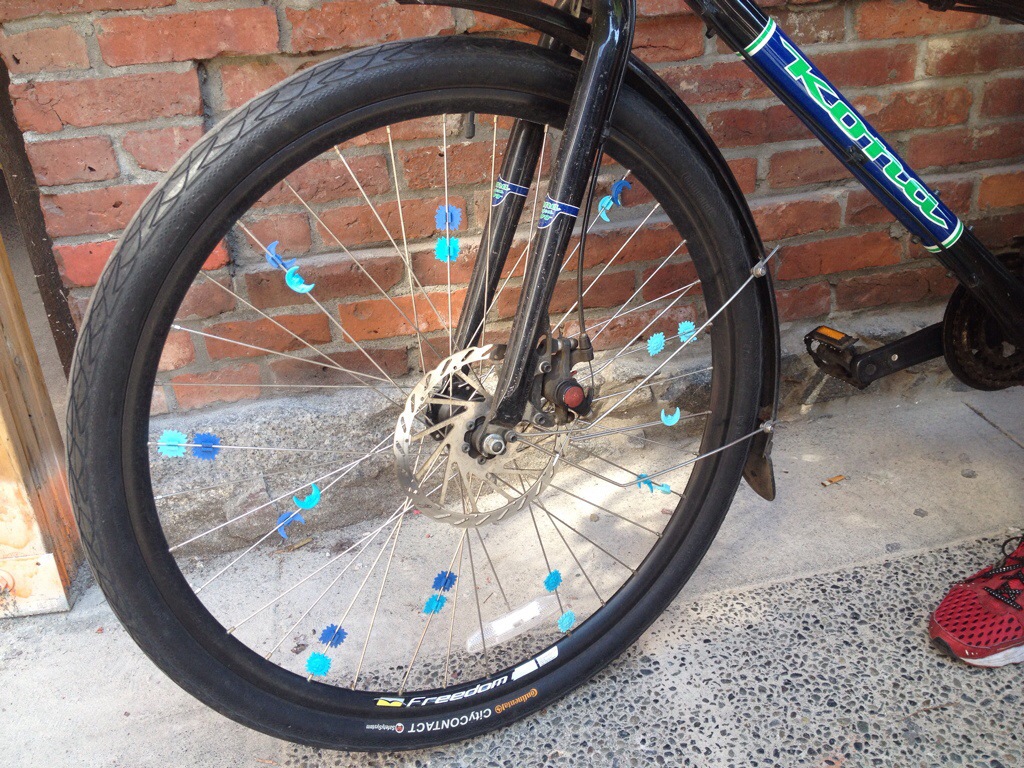 Behold our three bikes lined up–Surly Big Dummy, Workcycles bakfiets, Surly Big Dummy, at the outdoor orchestra. I was quite taken by Mike’s Schwalbe Big Apple tires. I know they provide a cushier ride than my Schwalbe Marathon Plus tires, but they don’t boast the same flat-resistance. However, he said he’s been rolling strong for three years on this set. Perhaps once I’ve destroyed my current tires I’ll make a change, but I’m not one to swap away perfectly good tires…especially when they’re the most flat-resistant ones on the market.