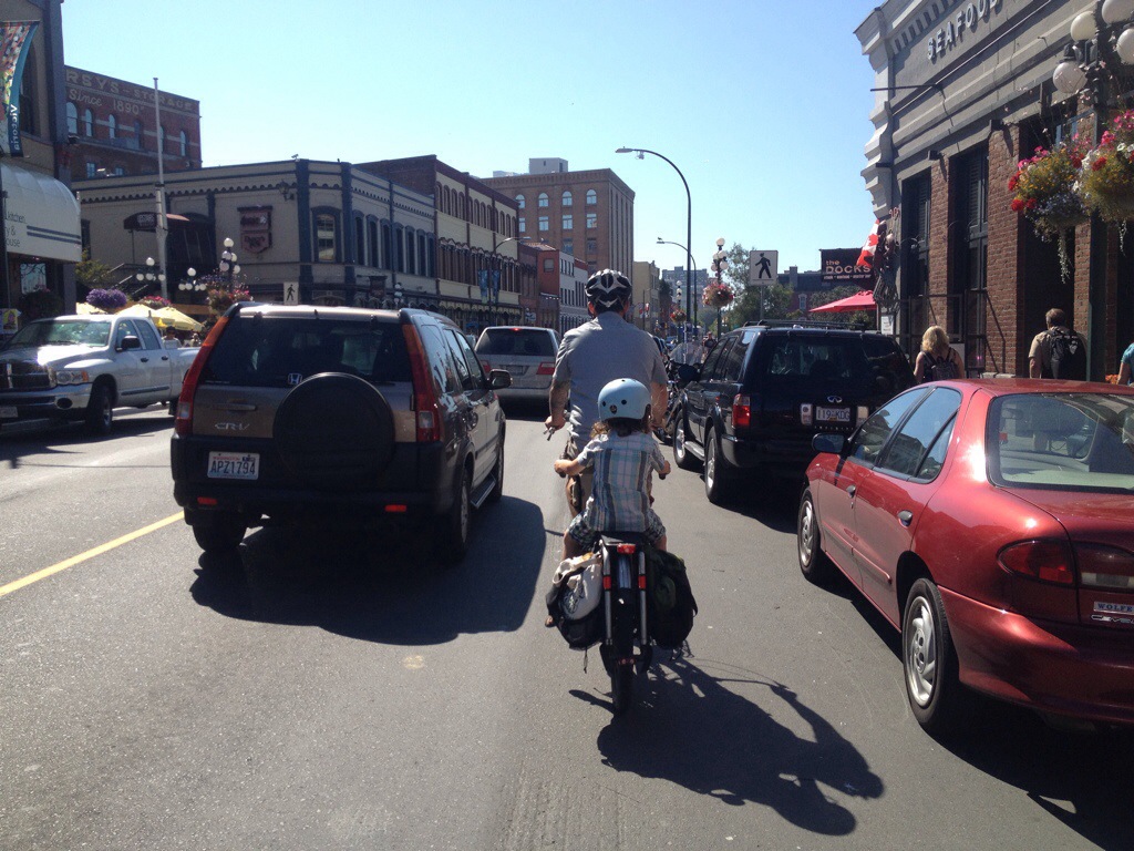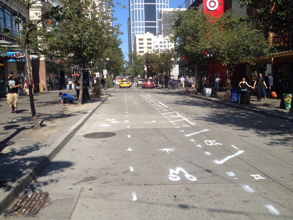 The next morning we hopped the Clipper back to Seattle. Again, the trip was quick and uneventful, but things had changed at home! I saw markings in the street for a two-way protected bike lane on Pike Street, between Pike Place Market and 2nd Avenue. I wouldn’t have noticed them had we not been avoiding the Hempfest teardown and taken the direct-but-trafficky route home. Thanks Hempfest!