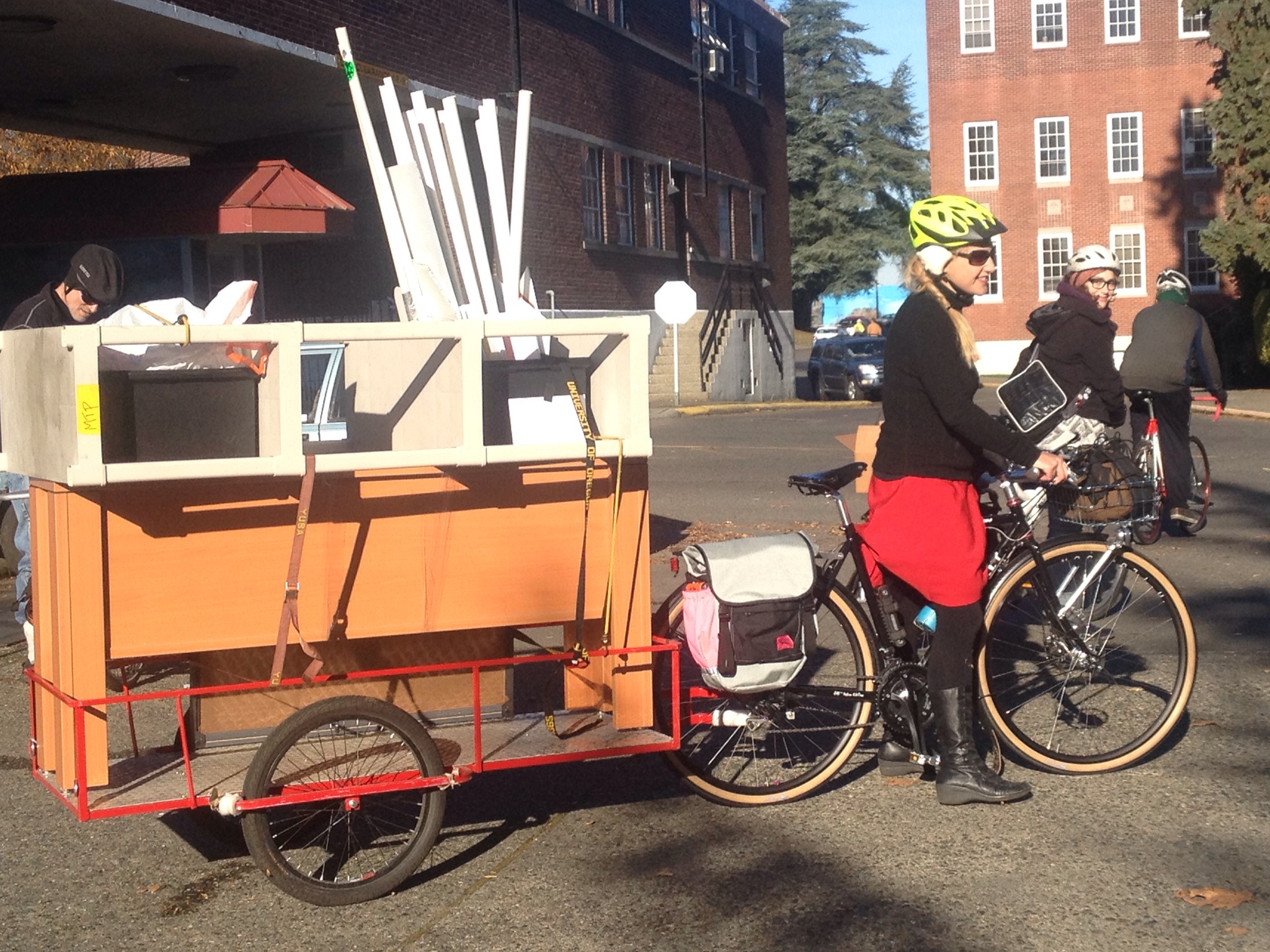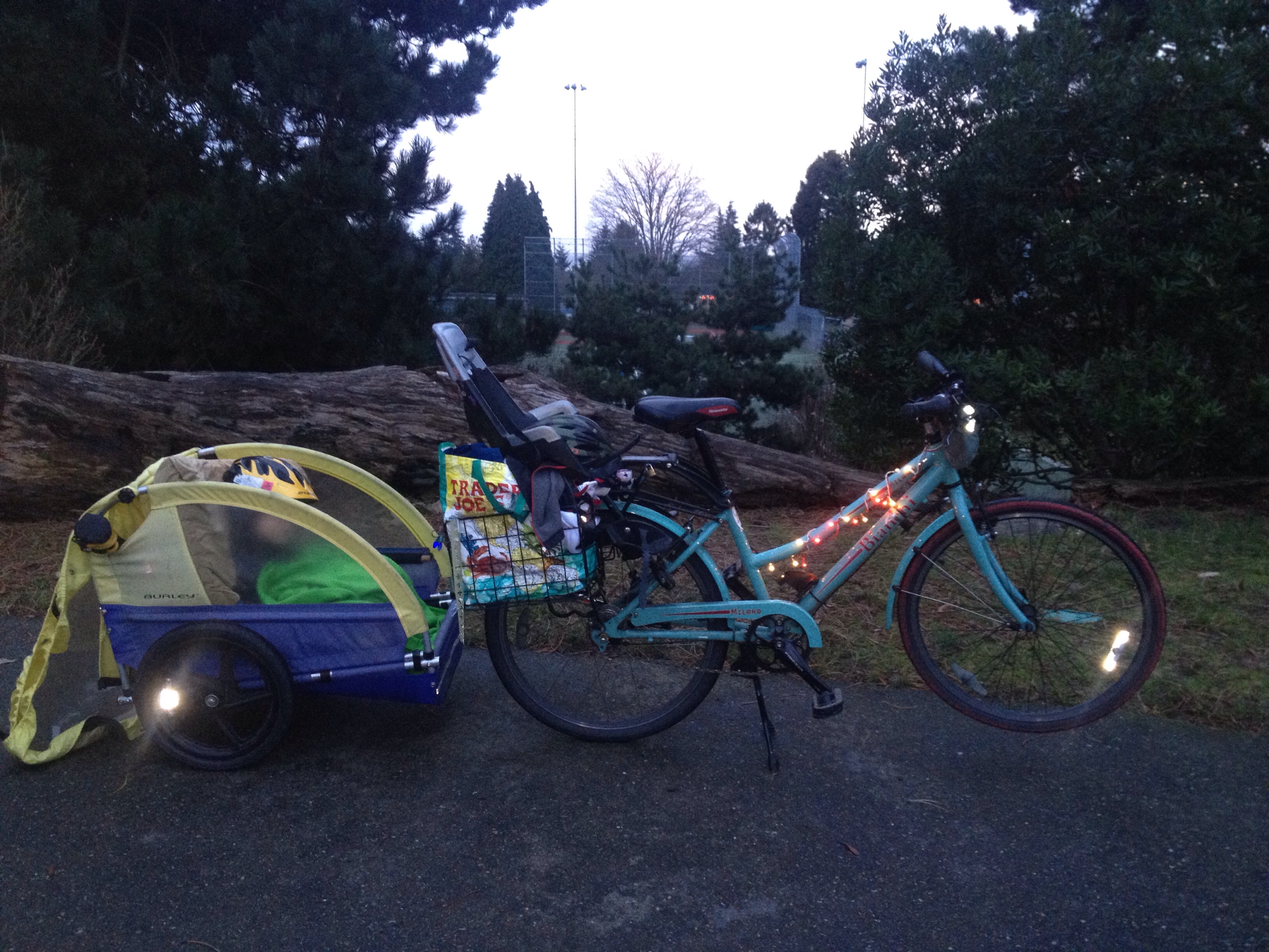 My original plan was to leave home early in the day, like last year, because it’s difficult to rally to get out the door once it’s late in the day and dark. However, a sick five-year old kept us home all day (he slept from 5:00 p.m. Saturday to 2:00 p.m. Sunday!) so rather than cancel the ride, I opted to take the old mamabike and stick him in the trailer with a blankie and stuffed animal. He was eager to hang out and stay awake for a while so it worked out well. Thank goodness my seven-year old is still light enough that he fits in the Bobike maxi rear seat. But I have to admit this setup was pretty heavy for the eight-speed Bianchi Milano and gave me a reminder how much I respect those with insufficient gear range for our hilly city and/or those saving up for electric assist bikes who are struggling for the time being.