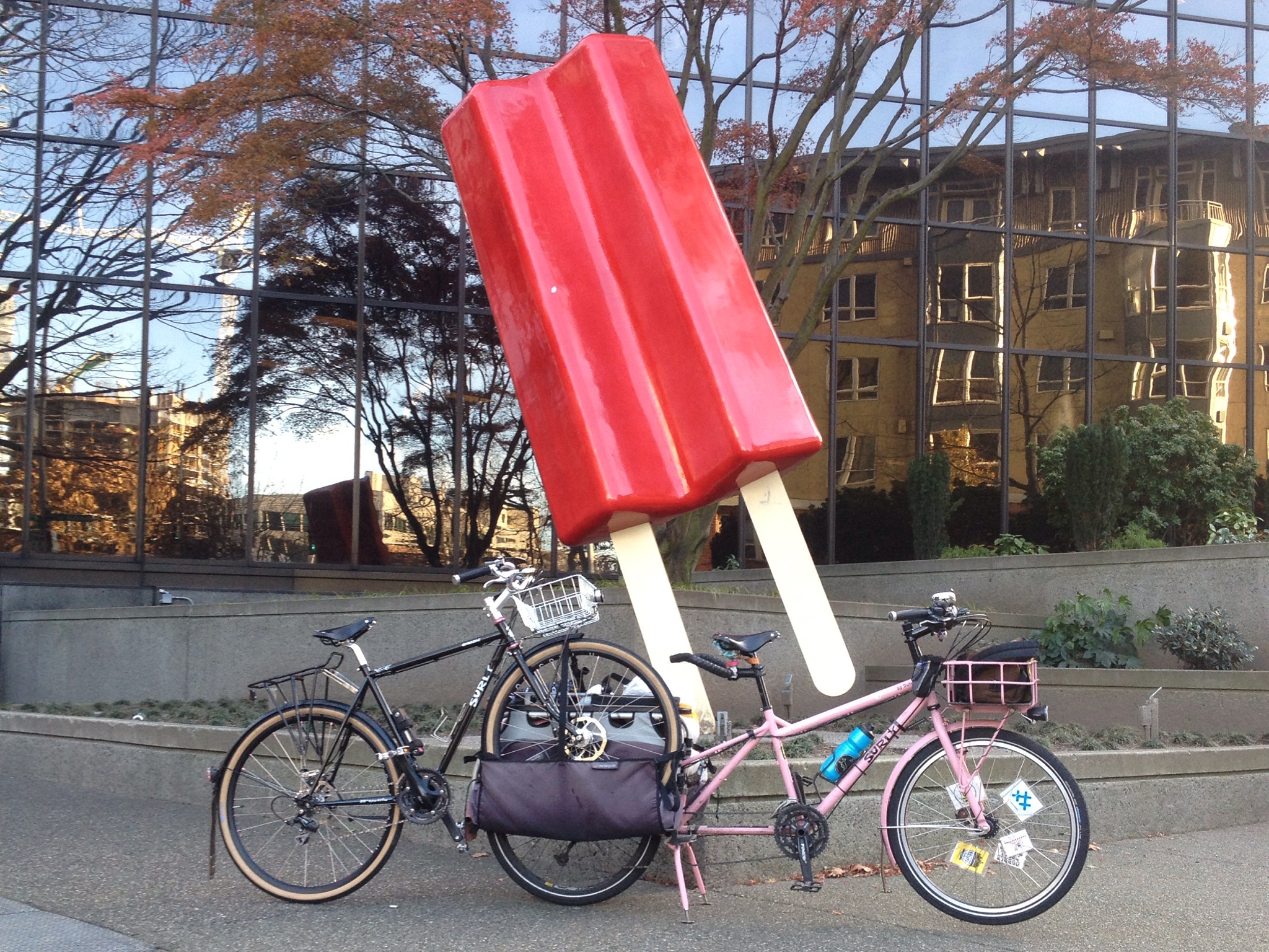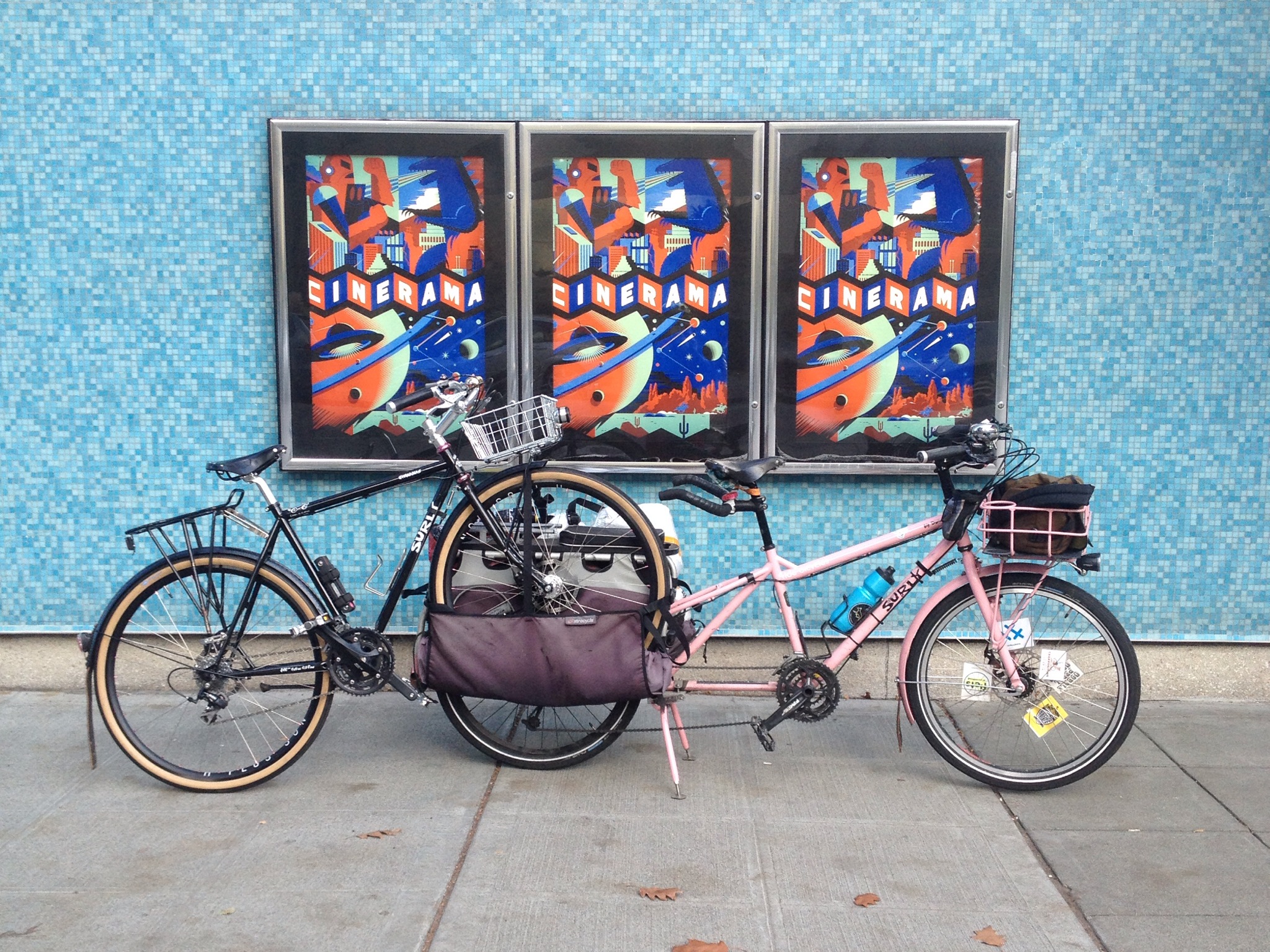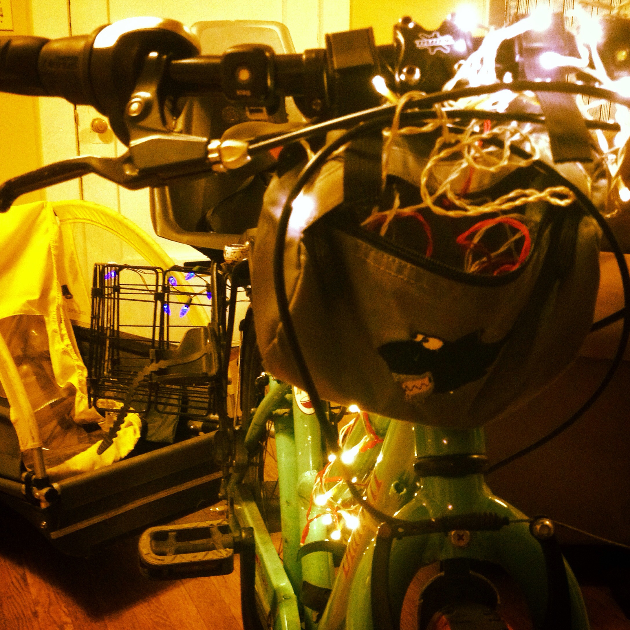Part of the fun of a holiday lights ride is stringing extra lights on one’s bike, but due to the last-minute vehicle change, I tossed on what leftover battery-operated lights I could find before rushing out the door. I attached my seven-year old’s shark handlebar bag to hold the battery packs and wrapped red and white strands around my top tube, candy cane style. These lights aren’t waterproof, by the way, but they’ve lasted a few seasons, which is apparently not bad per Car Free Days: Light Up Your Bike with Battery-Powered-Holiday-Lights one- or two-season light estimate. The little white and red lights are from Ikea and the blue lights on my rear baskets are from Bartell Drugs.