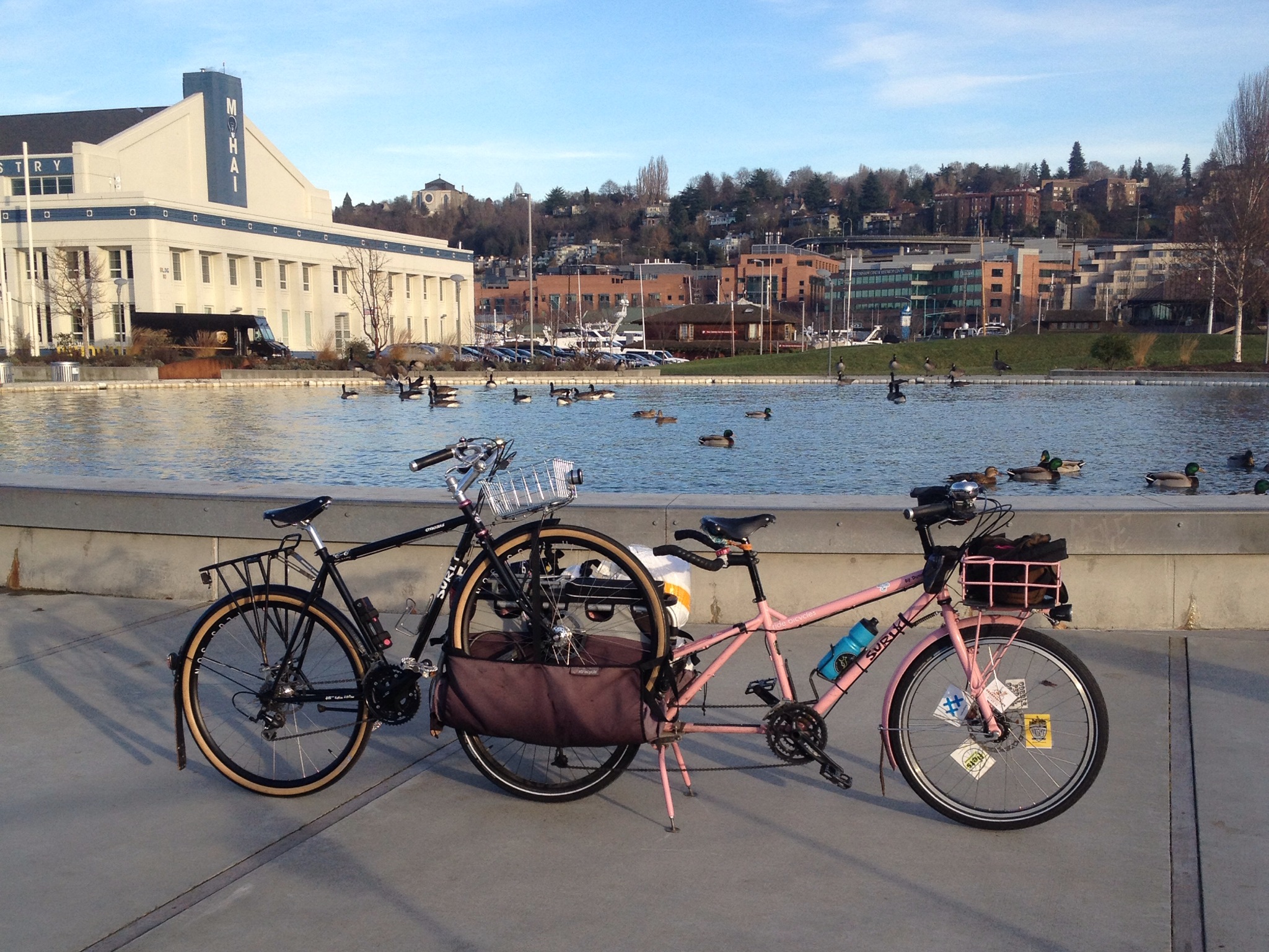 However–and this is mainly a note to myself for next year–we’ll turn off at NW 95th Street next year. Riding down 96th afforded us a beautiful view of the Sound, but it’s a busy street without any spectacular lights we would have missed. Plus we’d cut out one uphill block of 23rd by turning earlier. Everyone seemed fine with the amount of hills–it wasn’t too hilly of a ride, but it’s nearly impossible to avoid some climbing in Seattle. The three Xtracycle EdgeRunner longtails had BionX electric assists and the Larry vs Harry Bullitt longjohn had an Ezee front hub assist, but the two regular bikes, the Yuba Boda Boda midtail, the tandem, and my rig were regular ol’ pedal-and-sugary-candy-cane powered.
