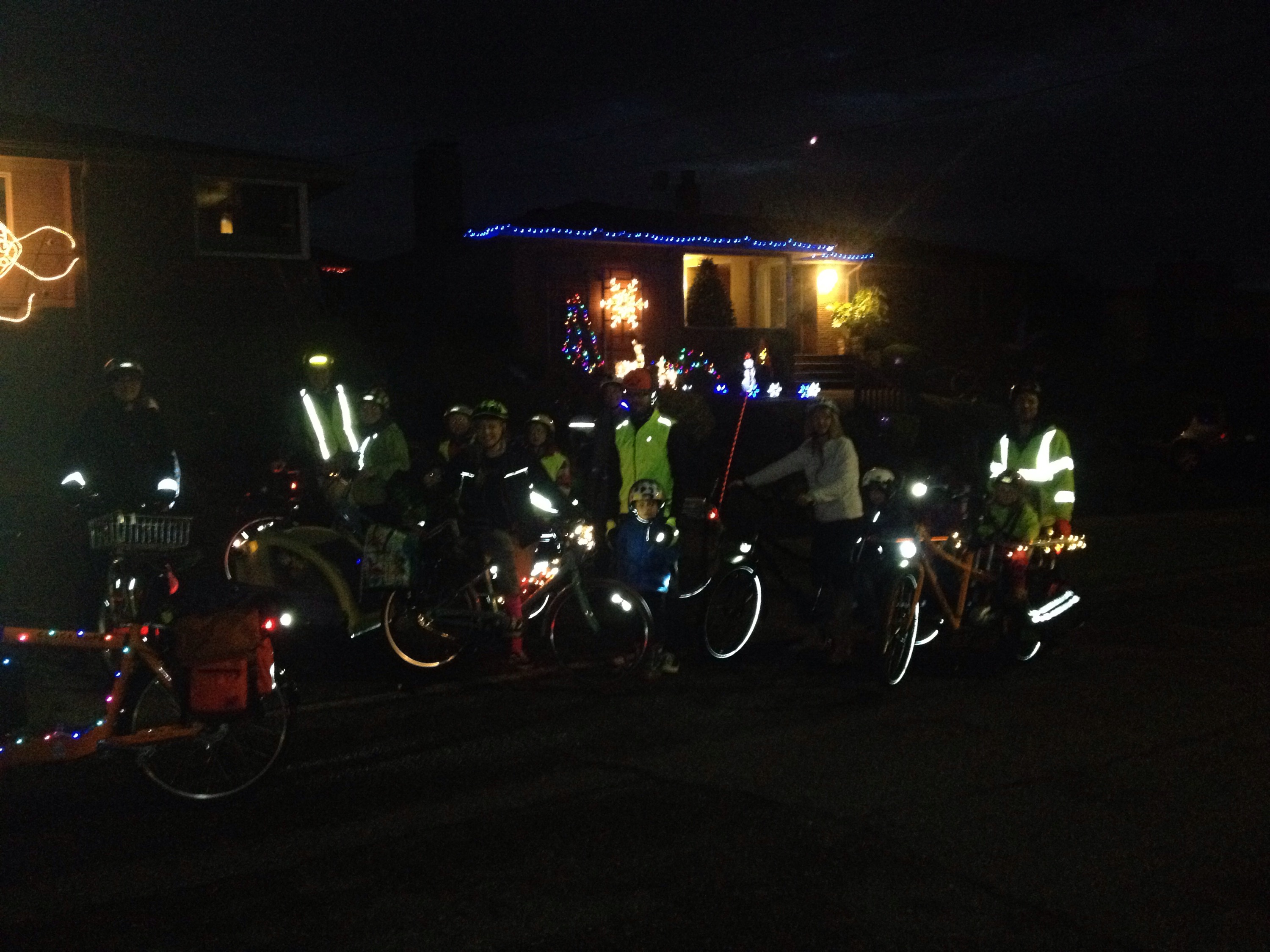 This was our third group ride (Critical Lass in 2012 and Kidical Mass in 2013) through the Olympic Manor holiday lights. Last year proved a little early in the season and not all the houses were decorated, so waiting until the 21st this year worked out well. Plus, the kids got to shout “Happy Solstice!” to everyone in addition to “Merry Christmas!” and “Happy Chanukah!” The weather was perfect and we had 20 participants.