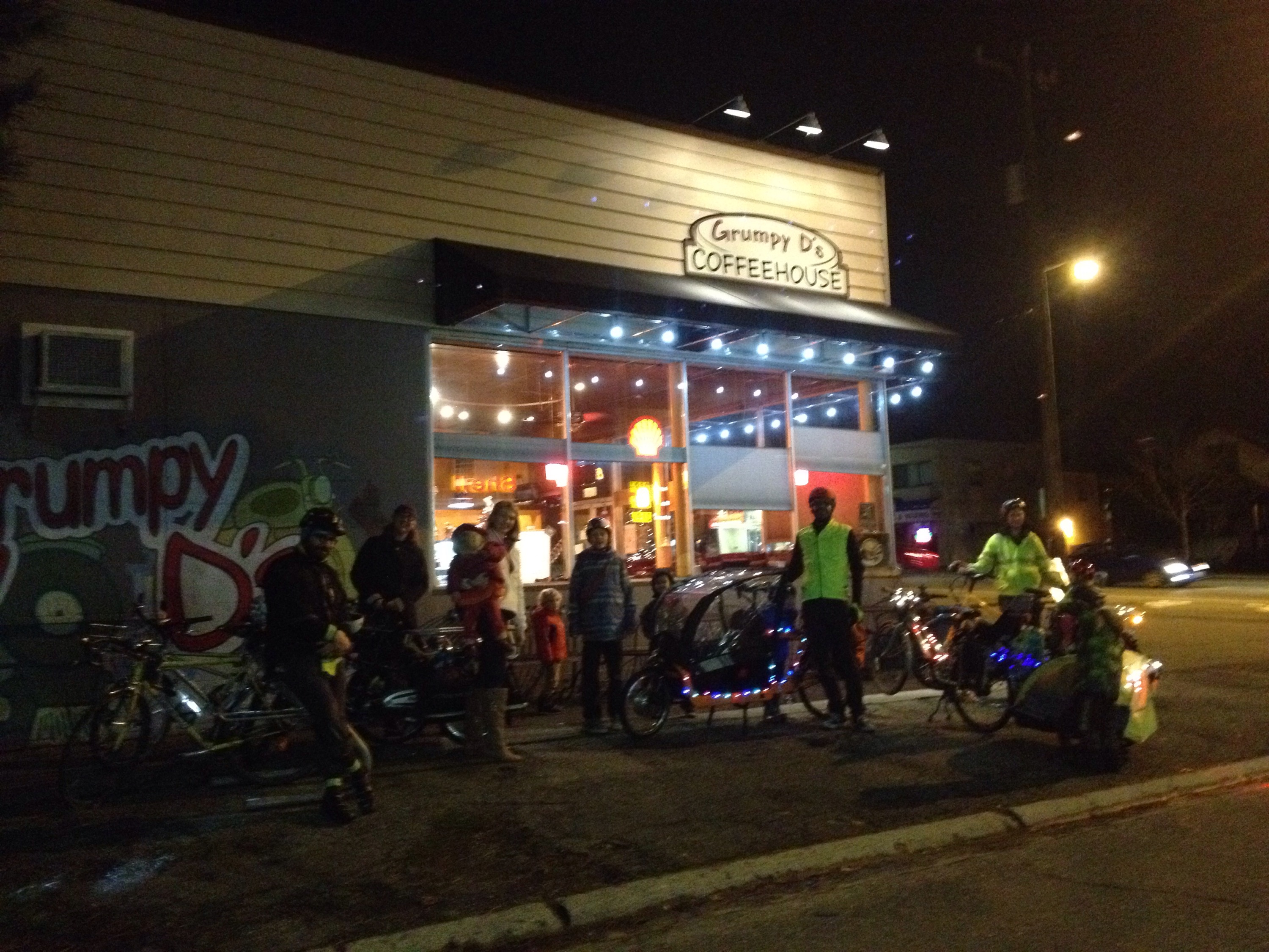 We arrived to Grumpy D’s Coffeehouse at 5:30 p.m. There’s a warm fireplace near a group of comfy chairs, plenty of table seating, and toys! I didn’t stay for the afterparty this year due to sick kid, and three other families peeled off during the course of the ride as they got close to home, but several families stayed for peppermint hot chocolate and other treats.