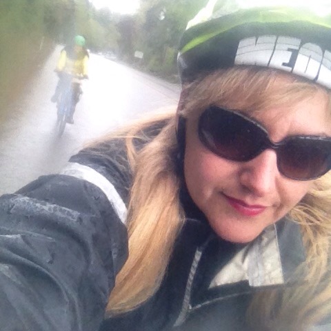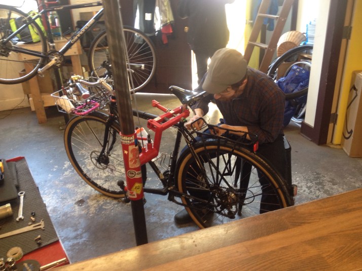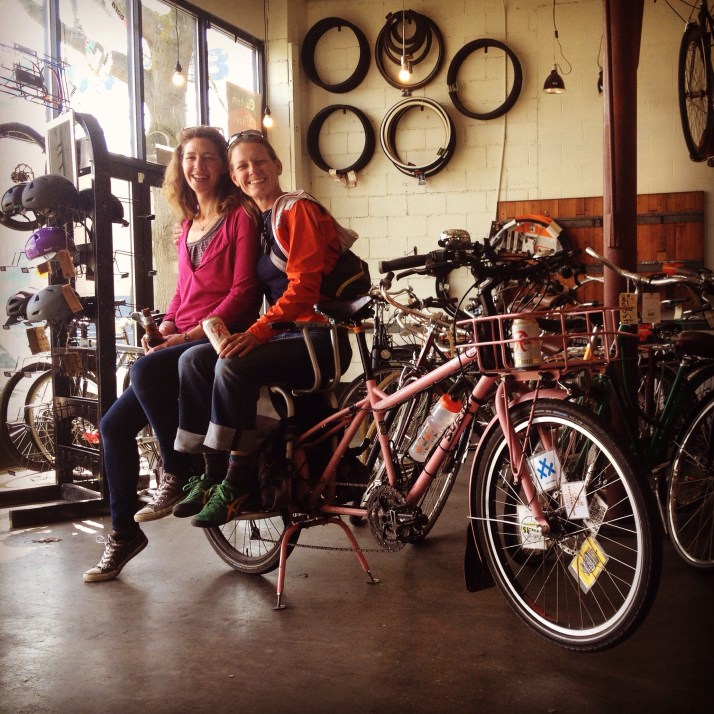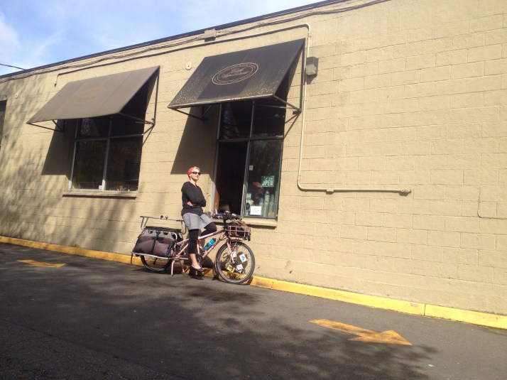We rode back into Victoria, this time along the north side of Langford Lake for more busy roads, but passable gravel to meet up with Eunice of Growing up Bike on her Xtracycle FreeRadical and Amanda on her Xtracycle EdgeRunner. We had arranged to meet at the Switch Bridge, where the Galloping Goose and Lochside Trails meet. We were a bit early and checked out Recyclistas Community Bike Shop right there and fell in love with the place.