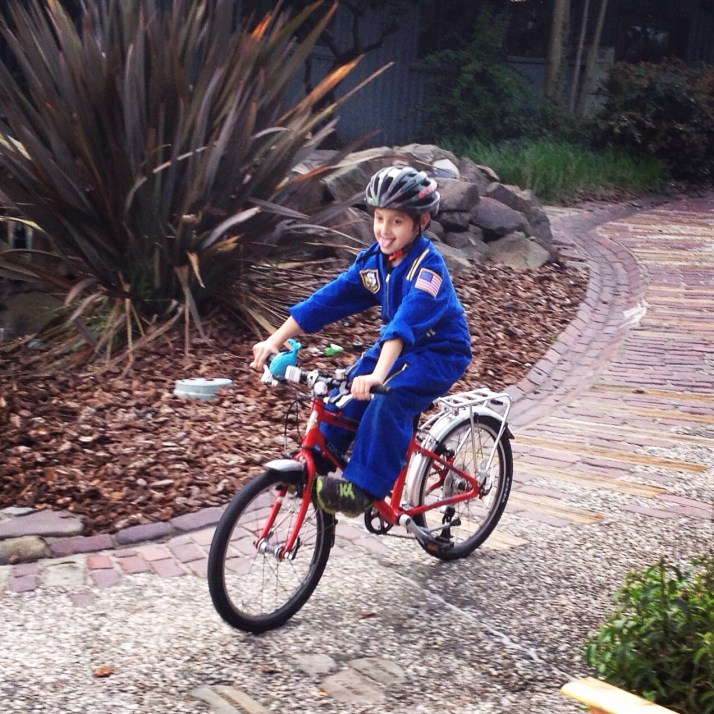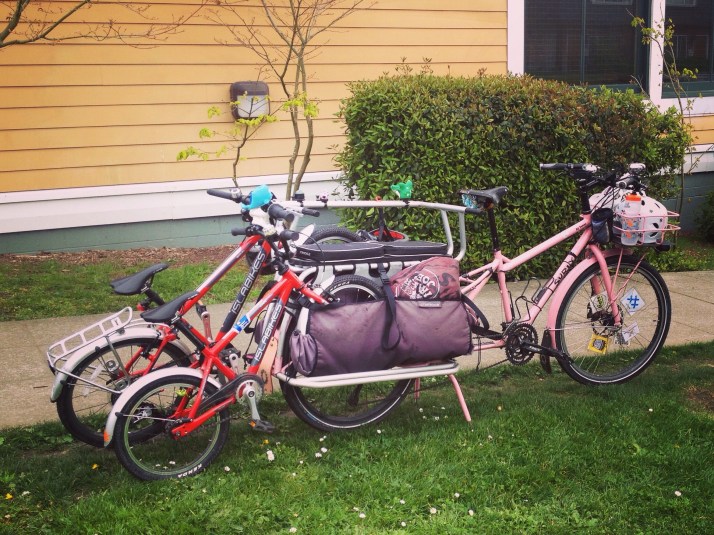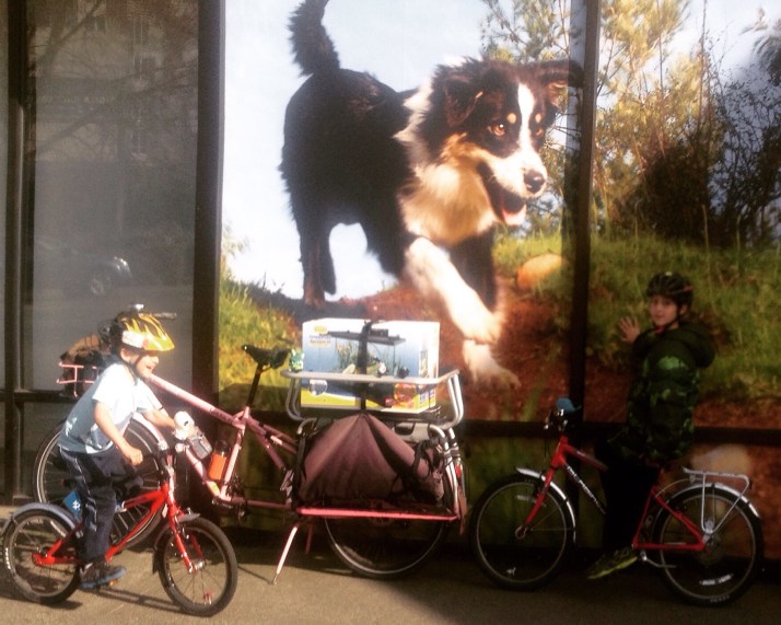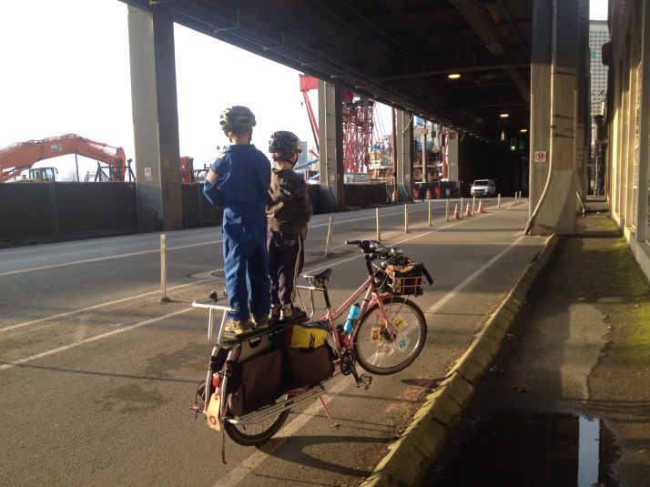 I hadn’t carried a big bike with both kids since swapping the Yepp Maxi seat for half-a-Hooptie and things are a little different now. My five-year old was very mad (as you can tell from the picture) about having his space invaded, so I’ll have to figure out a better system next time. I’ll probably have my eight-year old sit sidesaddle.