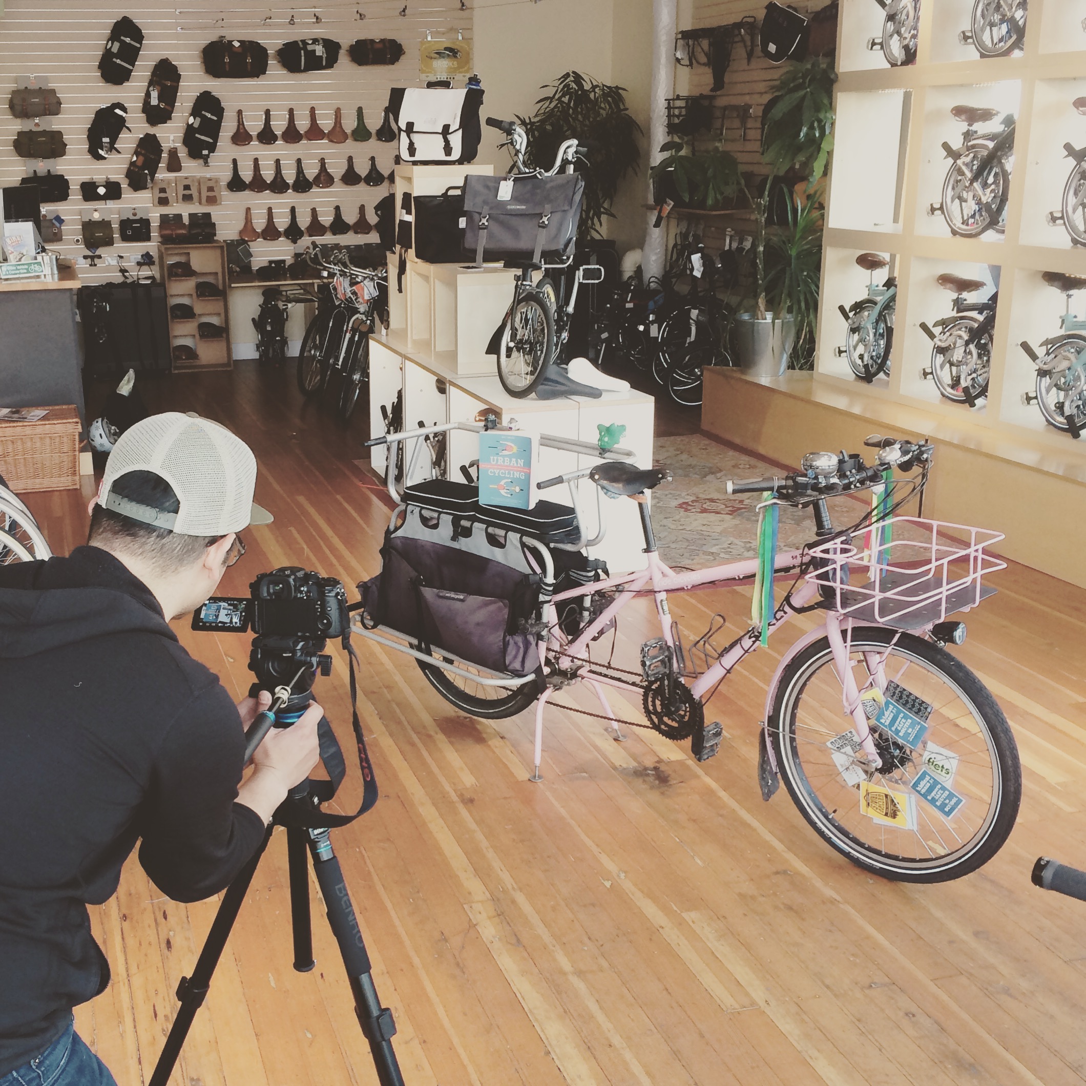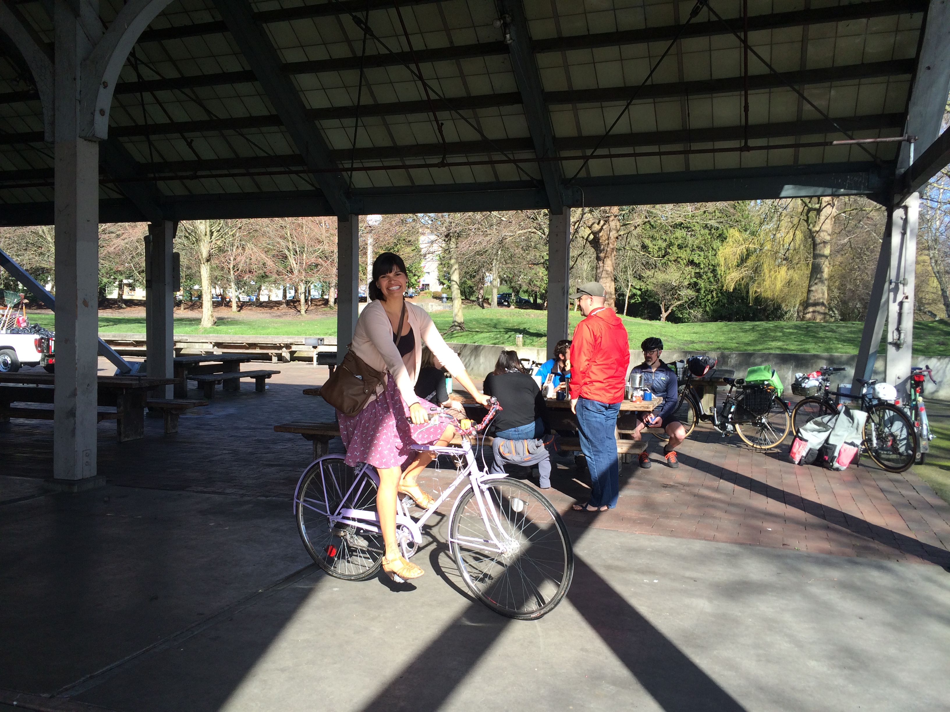 Marley and I had a grand plan to ride my tandem together for Chilly Hilly on Sunday. She came by R+E Cycles’ Bike and Pike Expo on Saturday, where I was spending the day hanging out with a stack of my Urban Cycling books. I had already planned to ride my tandem to the event because it’s R+E’s brand, Rodriguez (scored on consignment from the shop!). Knowing Marley could come by for a practice run made the plan even better. Between taking expo goers on tours of the frame-building facilities downstairs, mechanics took the kidback cranks off and moved the pedals back down to the adult position so Marley didn’t have to contort to six-year-old height. The test ride was fun! I was a little nervous because I’m not used to anyone actually helping back there and therefore am not practiced at the constant communication required for tandem riding (“Shifting!” “Coasting!”).