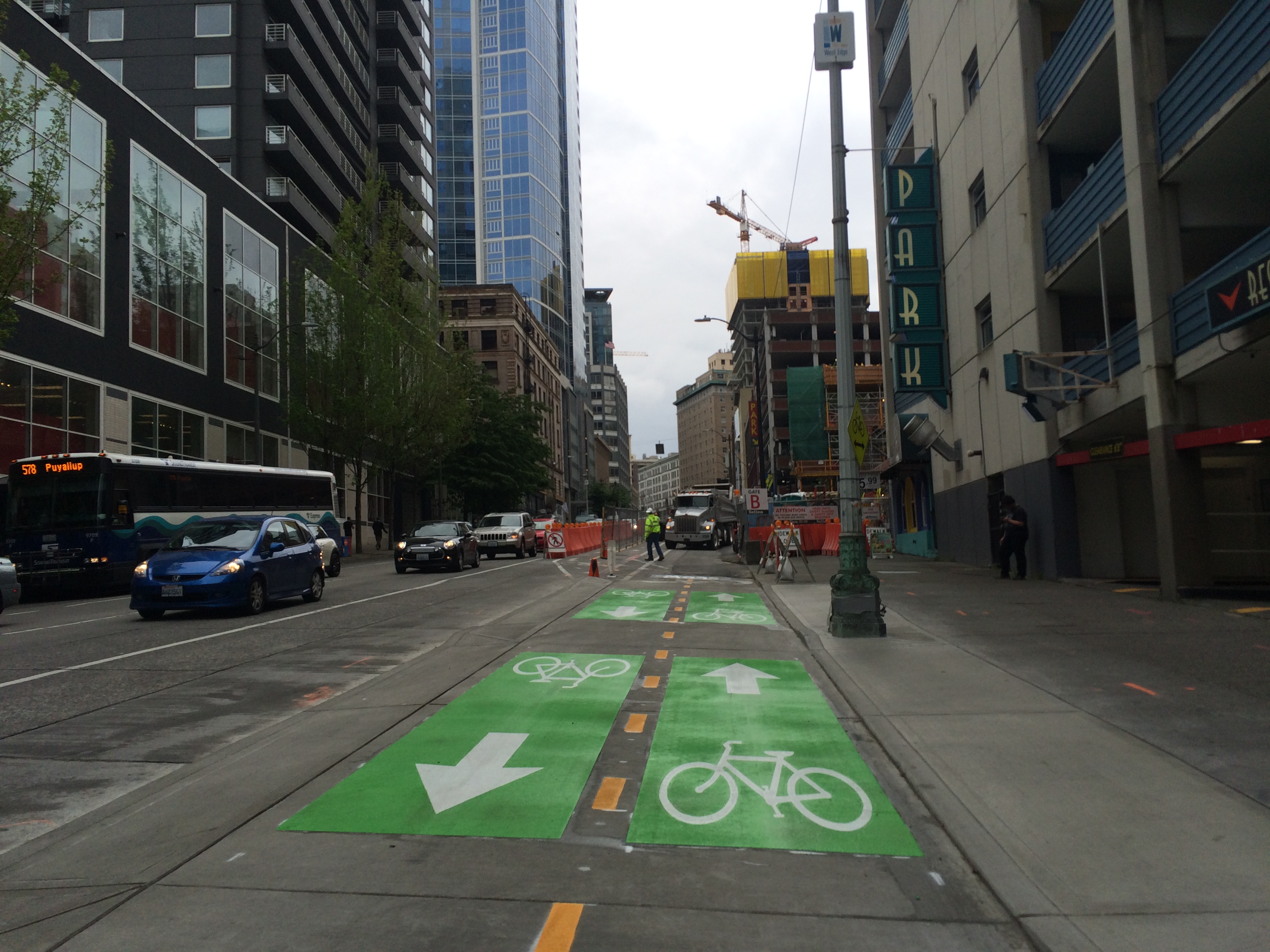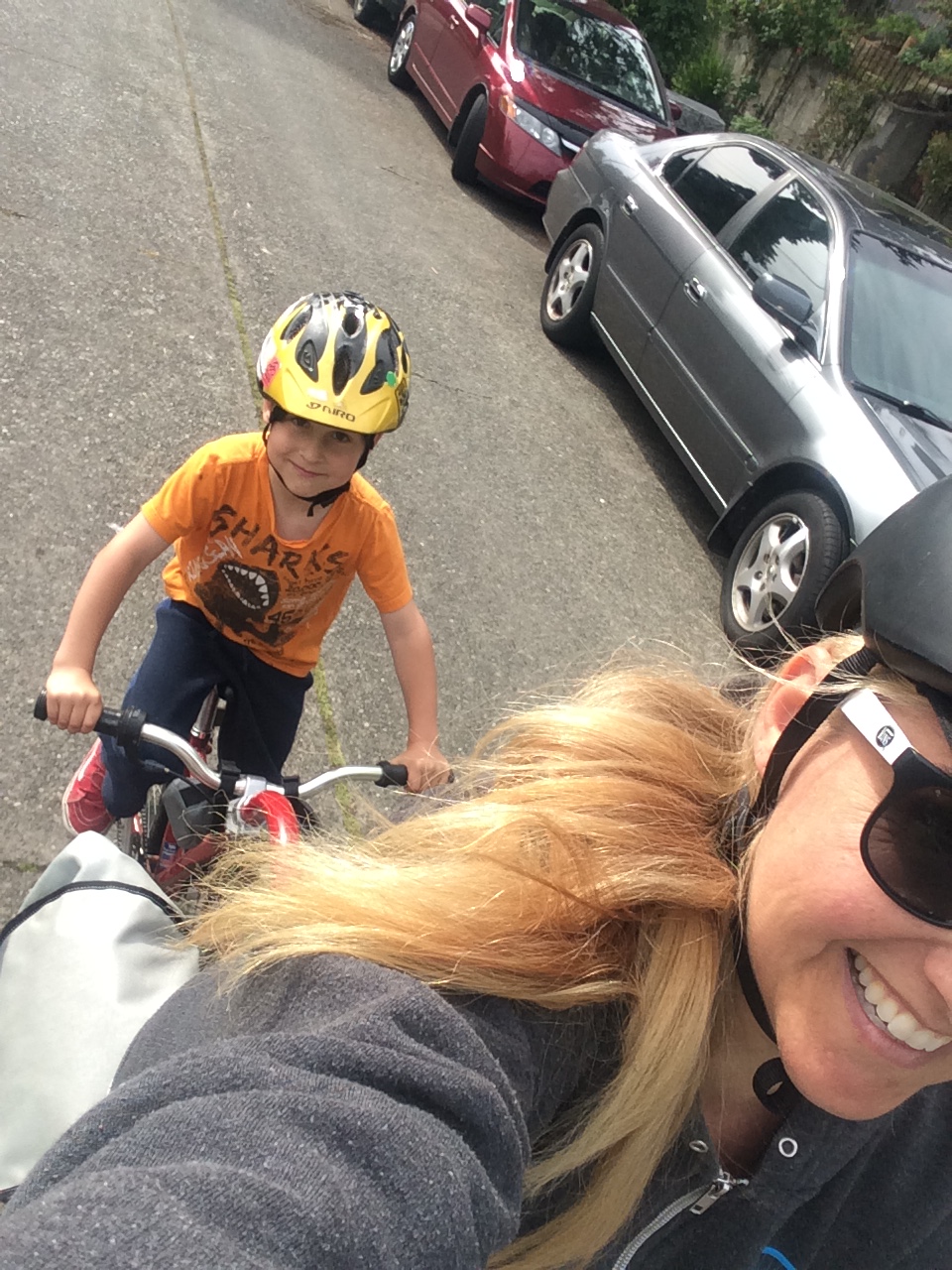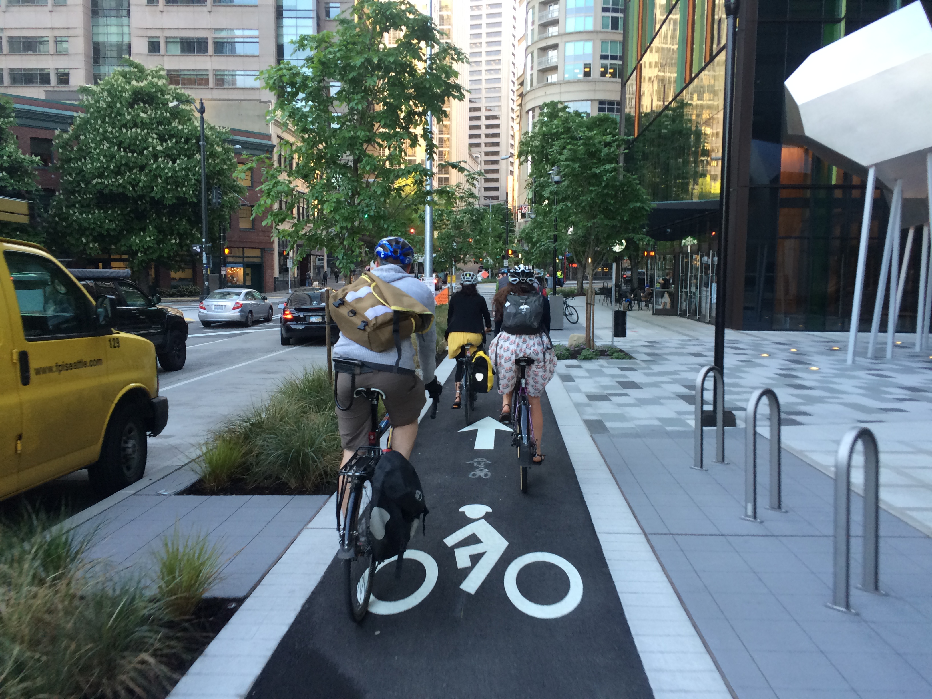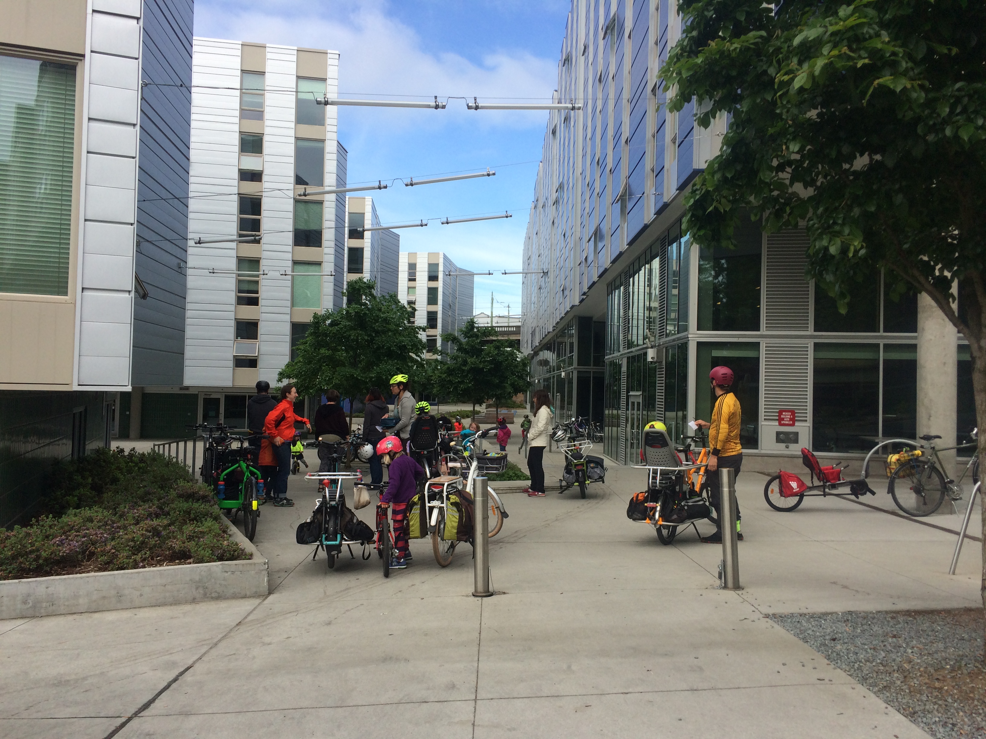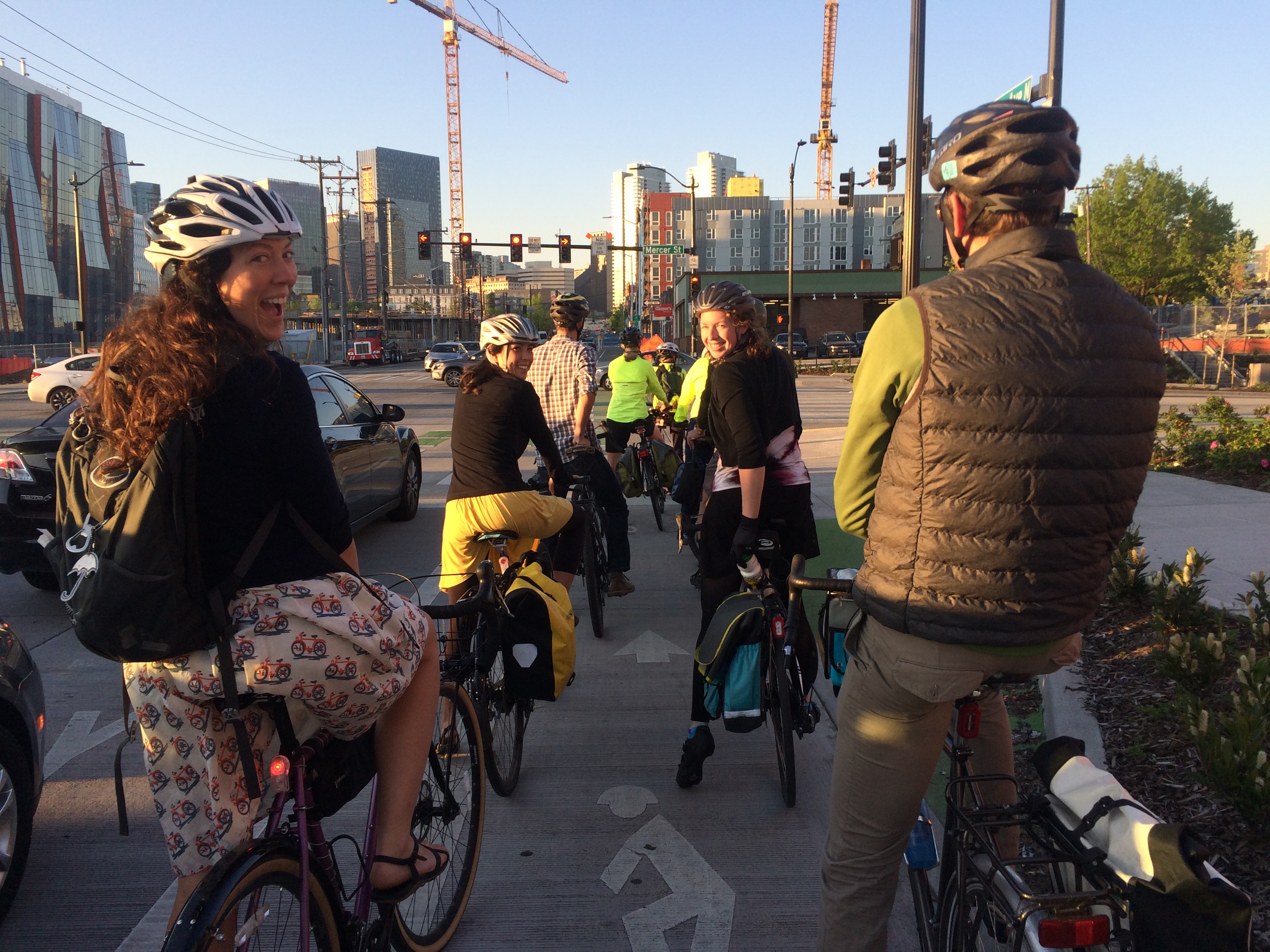 And then there’s the community of the biking public that continually lift my spirits. There are days I’ve had trouble shaking a bad mood, but I’m able to have a string of pleasant biking interactions that fix everything. Often it’s bumping into a friend and either stopping to chat for a few minutes if we’re traveling in opposite directions or sharing a few minutes of our separate-though-momentarily-parallel rides. And sometimes it’s just having a favorable interaction with a stranger, like the helmetless guy on a brakeless fixie while his normal bike was in for repairs who was happy to follow my kid-friendly route through South Lake Union on Thursday or a nice “Hey we have the same helmet” conversation at a red light on Friday. Not to mention the wonderful people I meet through bicycling. I’d imagine it’s not the only way to meet cool people, but I sure don’t know any other way. Today at my Urban Cycling book reading at the Burien Library I got to meet Meredith, a fellow family biker, in person for the first time…though I feel like I already knew her thanks to social media interactions. And yesterday was the same, though way different with Stevil Kinevil of All Hail the Black Market, my friend I hadn’t actually met in person before. He’s no family biker, but we still talked about all the pertinent stuff: bikes, art, homebirth, kittens.
