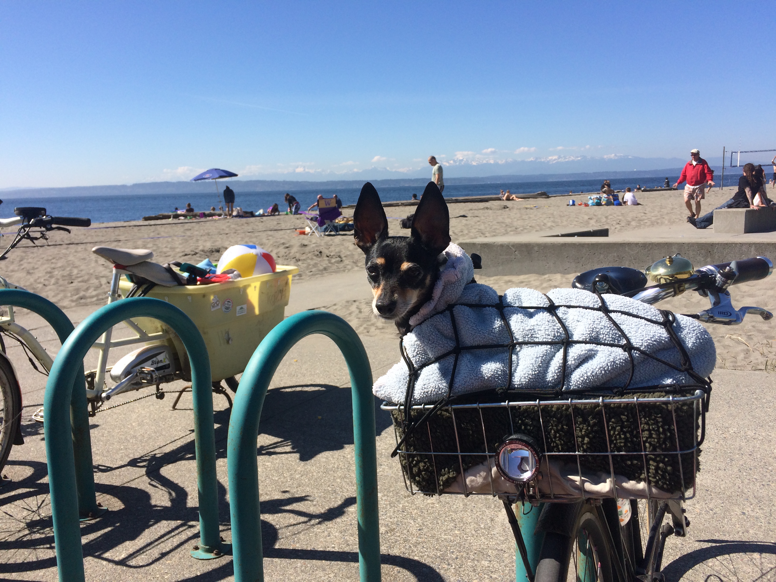 My day wasn’t quite as epic as I had planned. My original-original plan was to bike down to Tacoma for the grand opening of the expanded Defiance Bicycles. Although Seattle has many cool bike shops, it’s fun to visit cool shops in neighboring cities, too. But when I was in Tacoma for the Washington Bike Summit a week and a half ago, I found out they weren’t quite ready to open and celebrate. Plan B emerged at the summit when I was talking to Kyla of Green River Cyclery and I decided I should ride to Auburn instead. It’d be a perfect chance to take a better route than last time. But then I ended up sending a borderline sick kid to school and didn’t want to stray so far from home in case I had to fetch him (I didn’t). The weather was GORGEOUS so plan C was to take Pixie to our favorite beach, Golden Gardens. Perfect beach day!