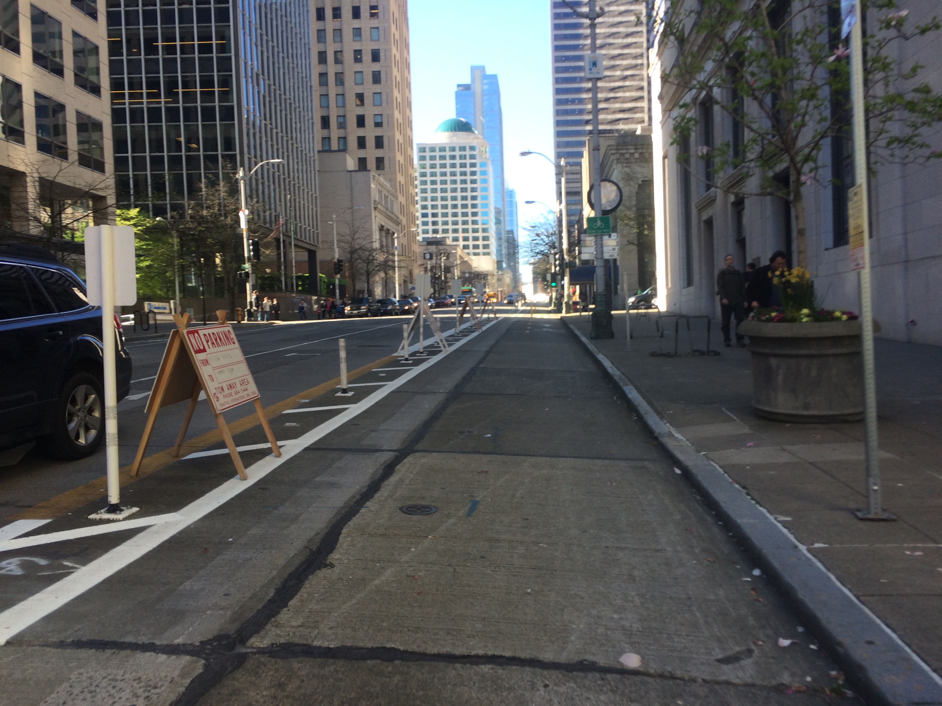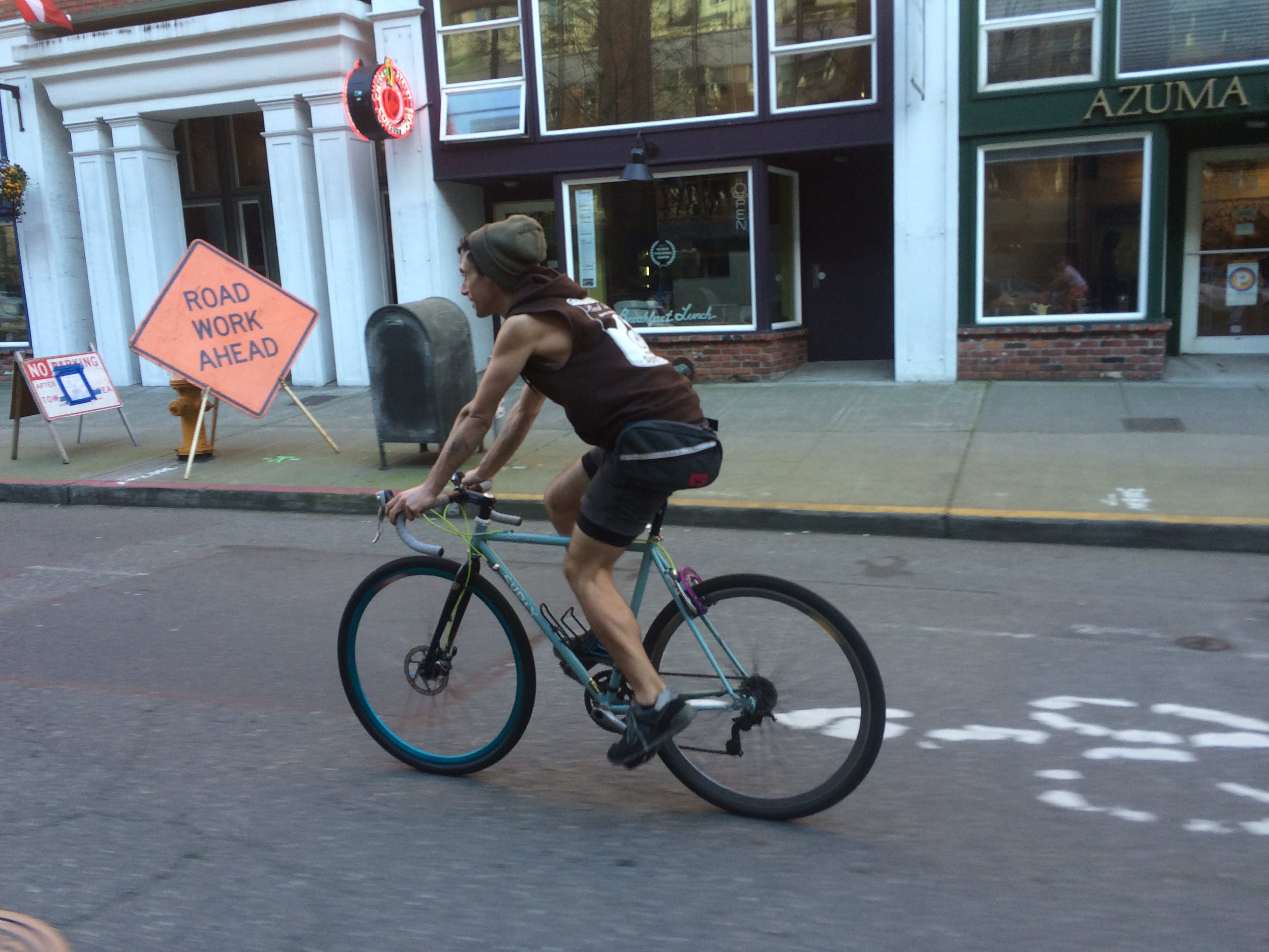 Downtown, the Second Avenue protected bike lane is a MESS right now. Lots of it is because they’re adding protective planters to the not-very-protective flexiposts (yay!) and part of it is construction. There are spots where the lane suddenly disappears and a one-block detour up a steep hill to Third (at that moment I wasn’t too happy about being on my single-speed bike). Someday, I think Seattle will add detours for bikes that are just as safe as the detoured facility. I’ve seen this in Portland (and photos in other cities) so I know it’s possible.