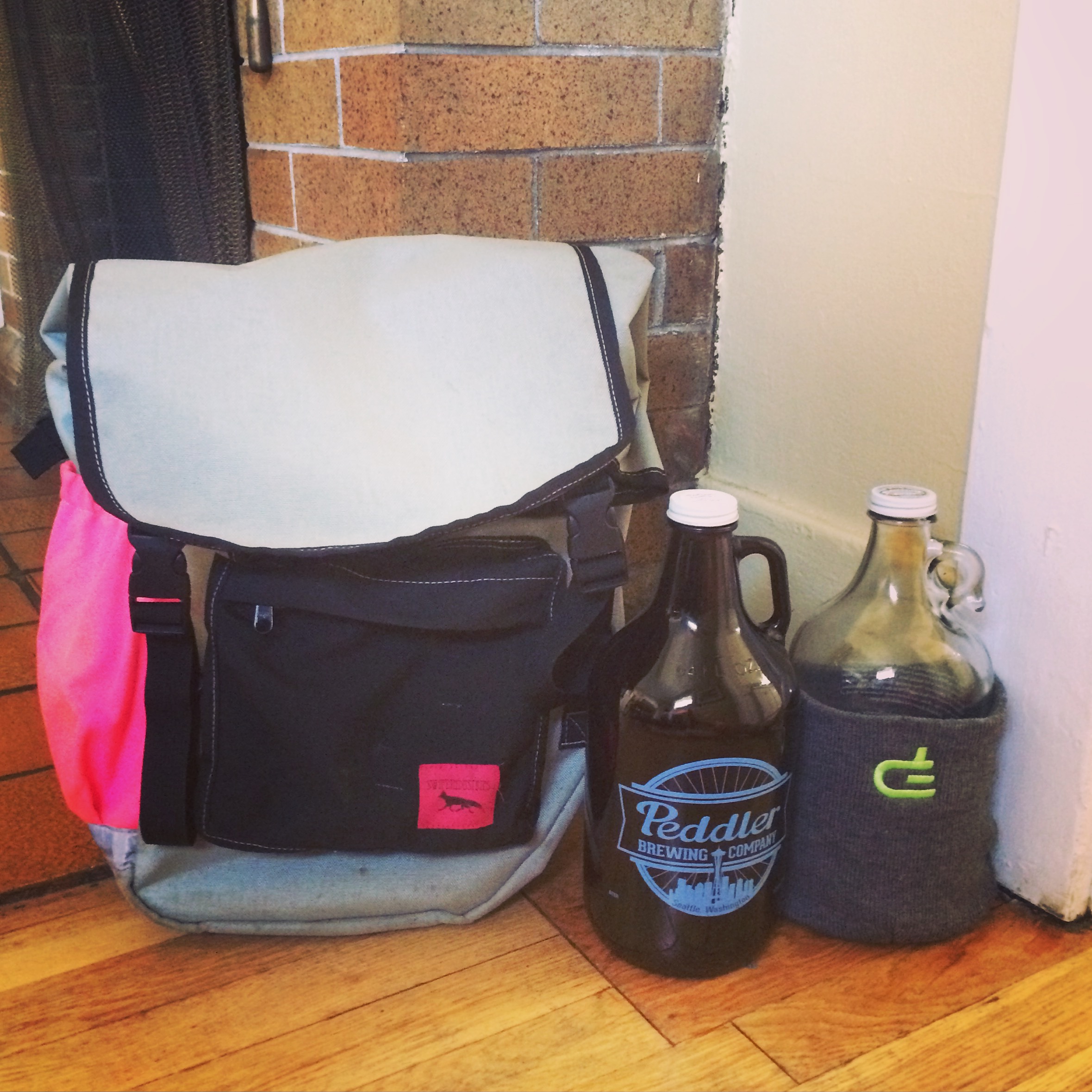 I tucked two empty growlers in my Swift Industries pannier after discovering my Pronto Cycle Share knit cap is perfect for keeping them from clinking against one another.