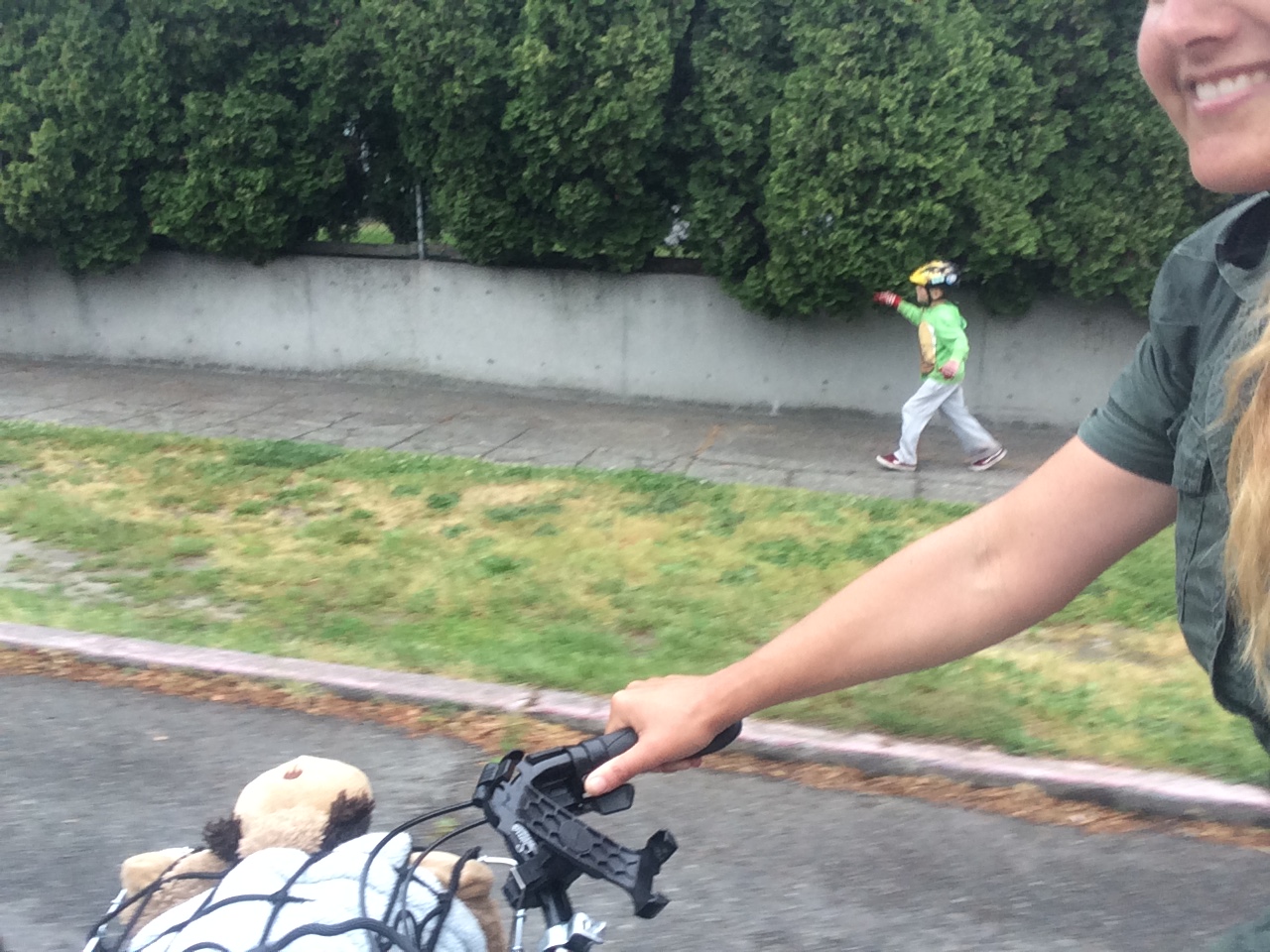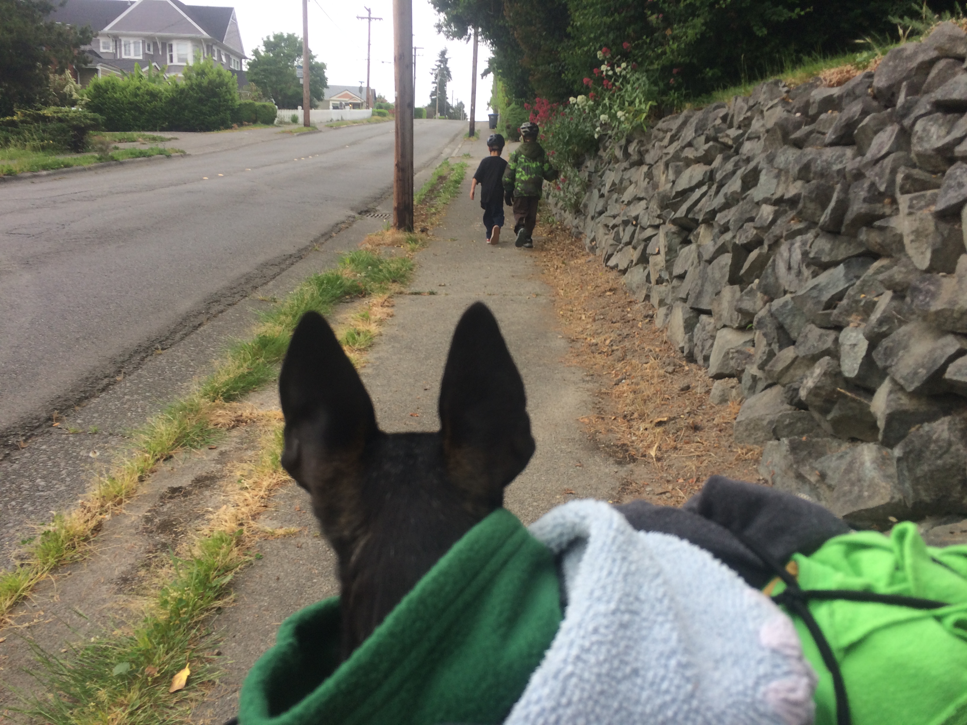 I studied the map ahead of time and opted to stray a bit from the Google Maps’ suggested route once across the Manette Bridge to cut out some elevation loss: like so, straight through the traffic circle, left on Pitt, right on 14th, left on Perry. I think this was better than my last route, cutting off some of the long slog up Perry. But it was still quite a climb and the kids opted to walk two blocks (thank goodness!) since our riding was so slow. The road wasn’t busy, but since we were so slow I kept to the empty sidewalk until Perry flattened out.