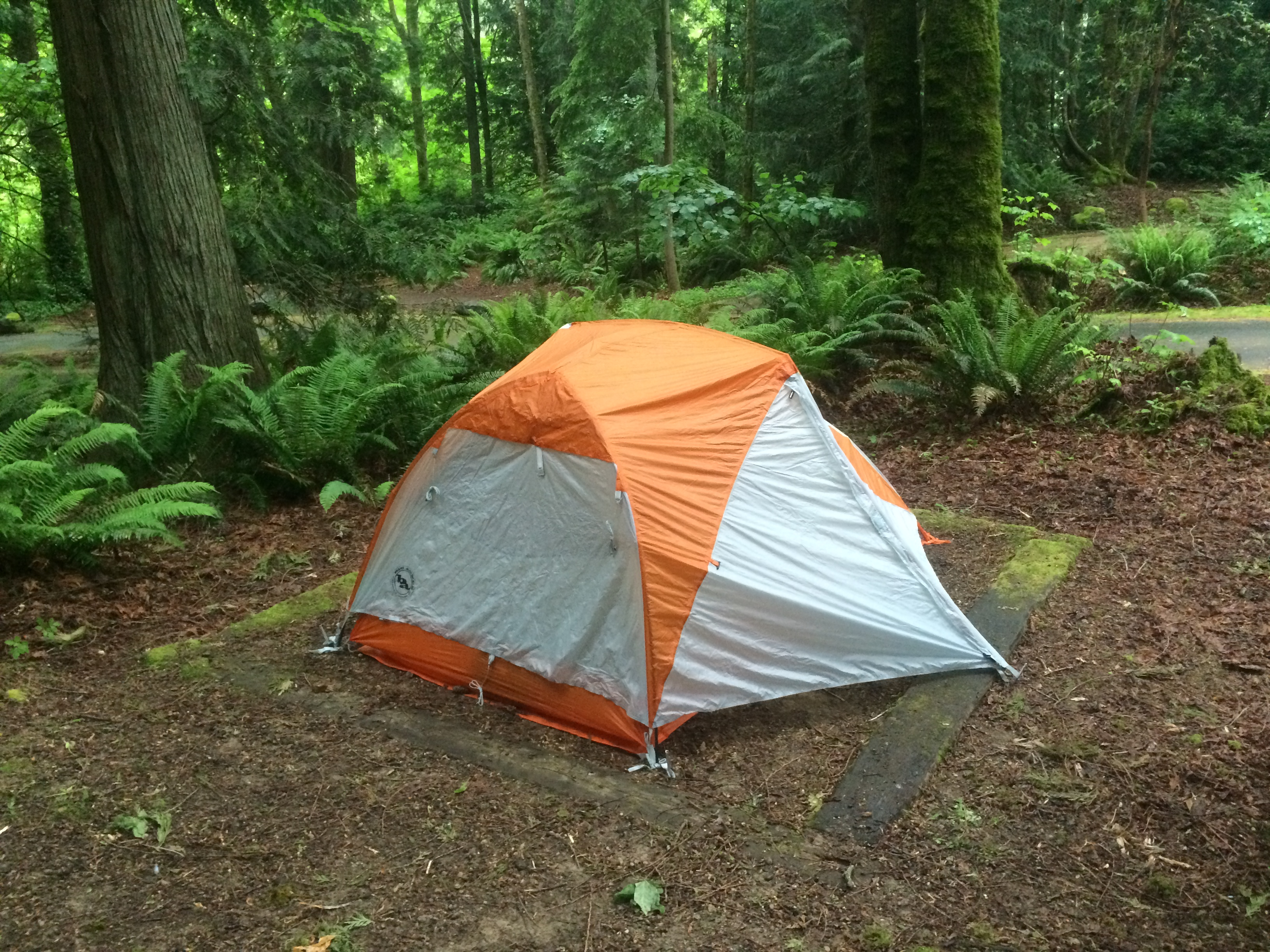 We biked the whole loop and the kids selected site 5. It was great with a direct path to the restrooms and two spots for tents, one of them a bit bigger than the spot at the hiker/biker sites. This was good because I brought two tents this time. The silly thing is, I didn’t bring my new small two-person tent when I camped with just Pixie because I didn’t want my brand new tent to get wet. But I’d never pass up a chance to carry extra stuff and this trip we crammed in the second tent, an extra sleeping bag, and an extra sleeping pad. Our original plan was to camp at Manchester State Park, but then we found out our friend Brad (one of my first friends with a Surly Big Dummy, before I got mine! Jon to my Ponch, I like to call him) was riding the 400k le Tour d’Hood Canal and would need to stay in Bremerton overnight. So obviously the smart thing to do was tote extra gear so he could sleep on the ground, right?